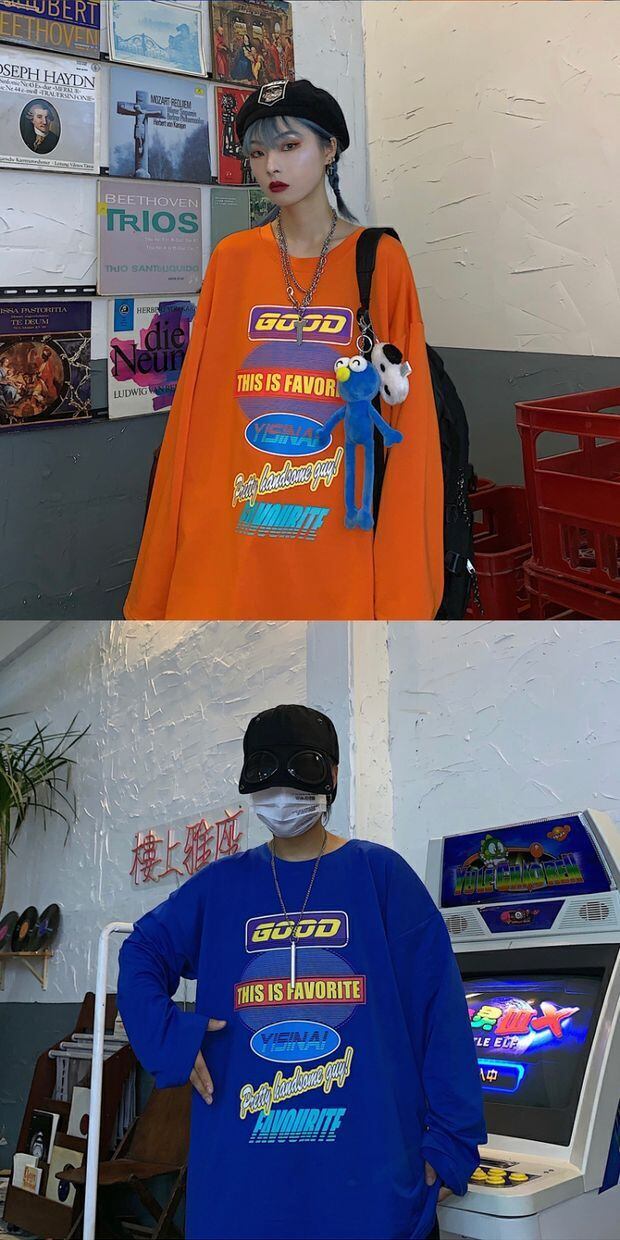 初秋ins原宿BF風ストリートレトロレタープリントルーズワイルド長袖Tシャツカップルモデルトップス デーモン4031166