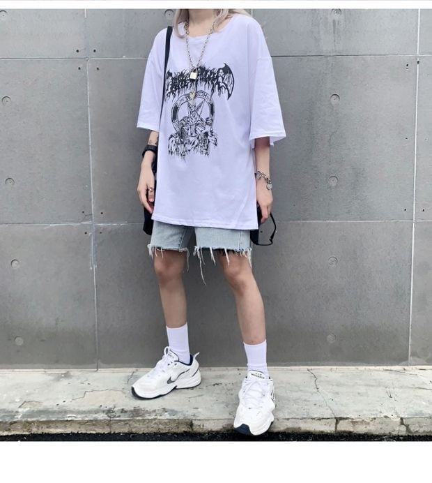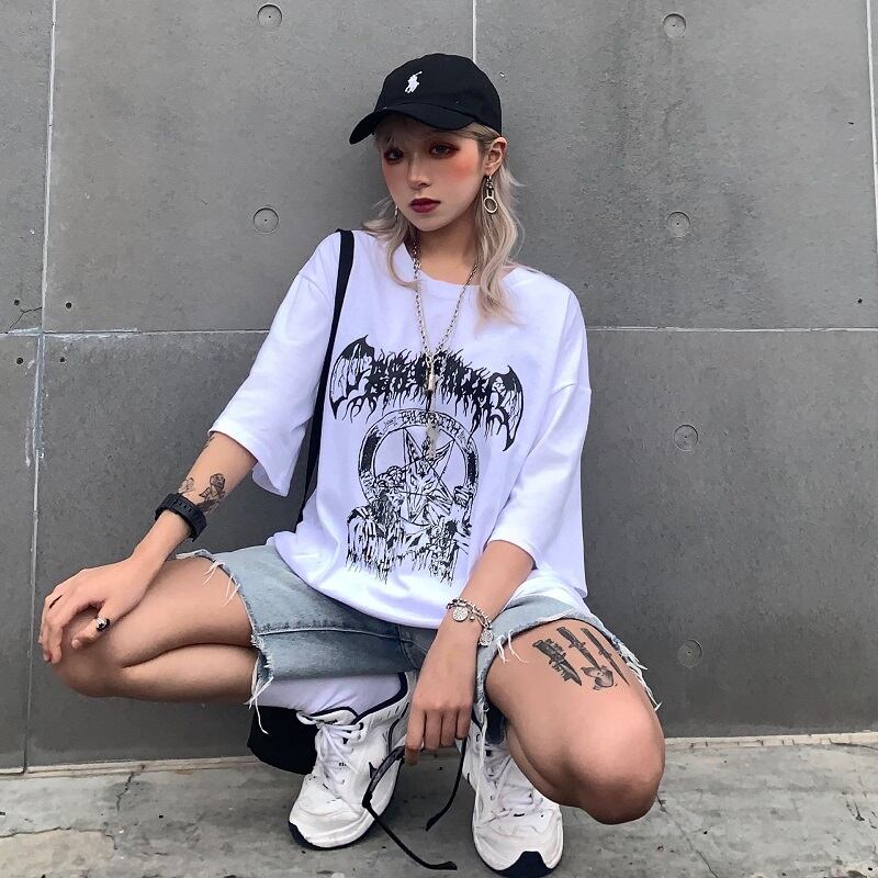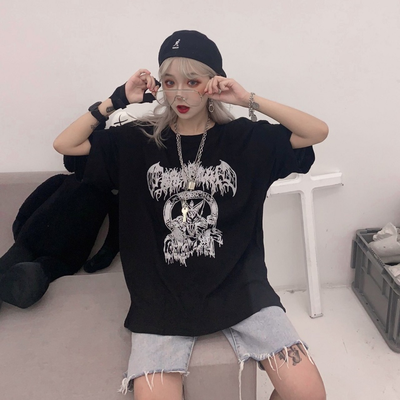 レディーストレンド韓国ファッションスタイルダークブラックスタンダードプリント柄ルーズTシャツシャツ レトロ ストリート 原宿 デーモン9279116