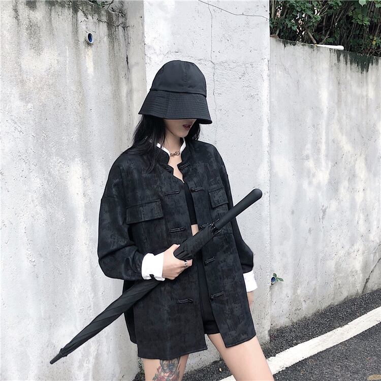 コート レディース韓国ファッショントレンドスタイルダークブラックスタンダードルーズカジュアル薄手シャツ レトロ 原宿 デーモン5385075