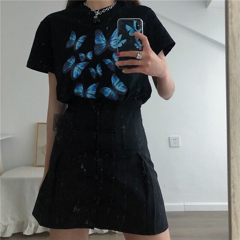 Tシャツシャツ レディース夏服韓国ファッショントレンドスタンダードButterflyデザイン プリント柄ルーズゆったりブラックトップス レトロ 夏物 デーモン7190101