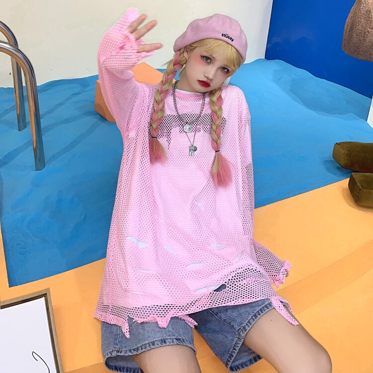 Tシャツシャツ レディースダメージ韓国ファッショントレンドスタンダードルーズメッシュ長袖 ロング レトロ 夏物 スタイル 長袖 デーモン6098896