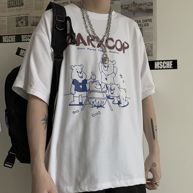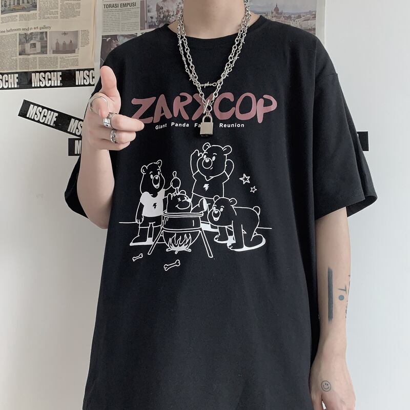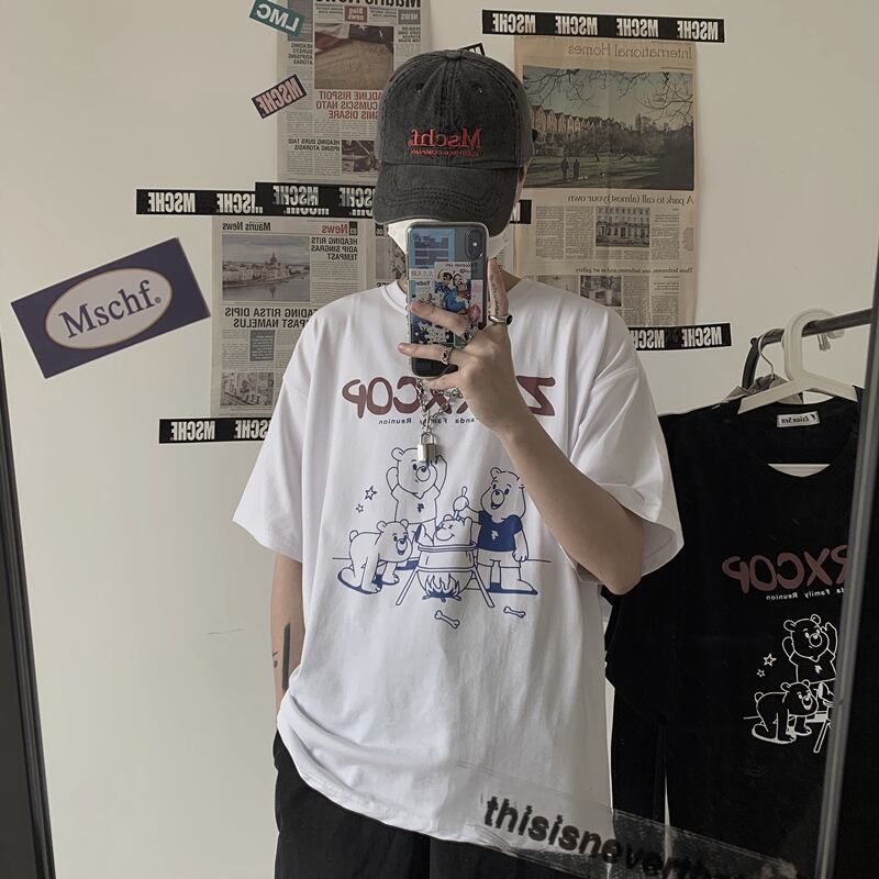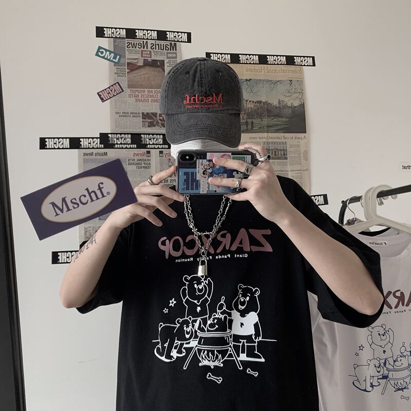 ホワイトTシャツシャツ レディース夏服韓国ファッショントレンドスタンダードプリントルーズゆったりブラックトップス レトロ 夏物 ボーイズ デーモン2588598