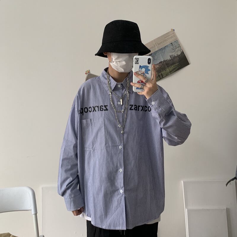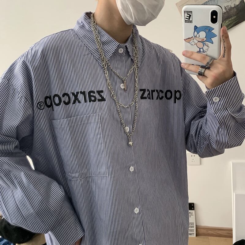 シャツ オータム韓国ファッションスタンダードプリントルーズストライプトップス レトロ 秋物 ボーイズ スタイル デーモン7465760