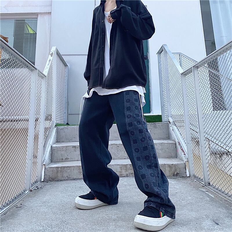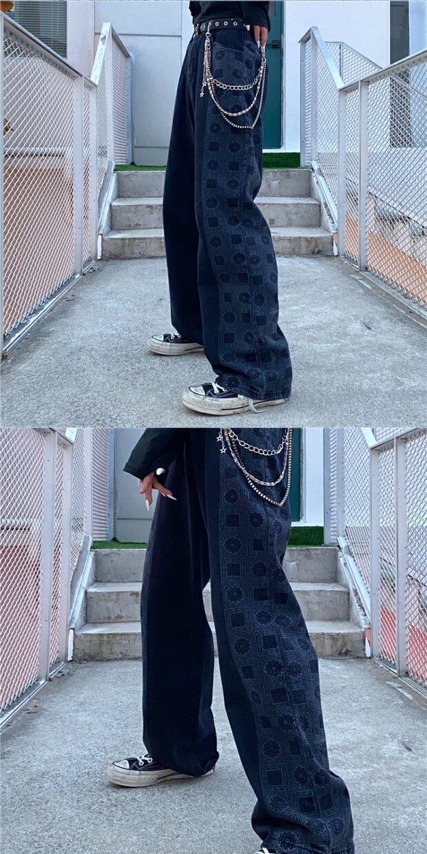 パンツ レディース韓国ファッショントレンドダークジーンズ ルーズハイウェストウェストカジュアル ステッチ スタイル ウエスト デーモン5181302