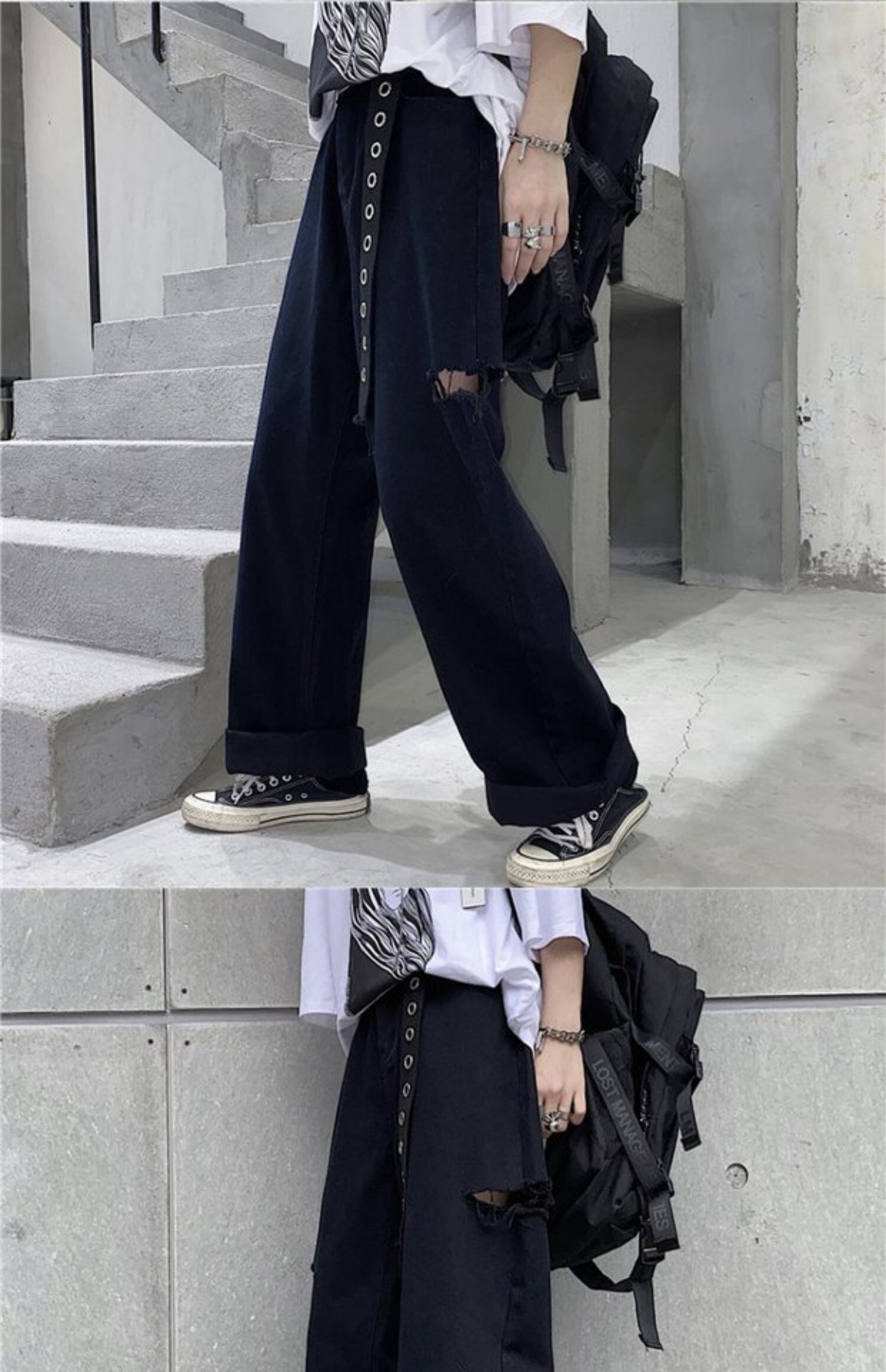 ブラックパンツ レディーストレンド韓国ファッションスタイルジーンズ ハイウェストウェストルーズ ウエスト デーモン3215144