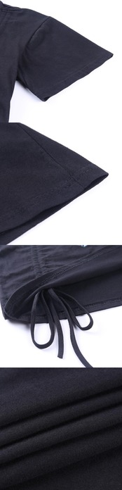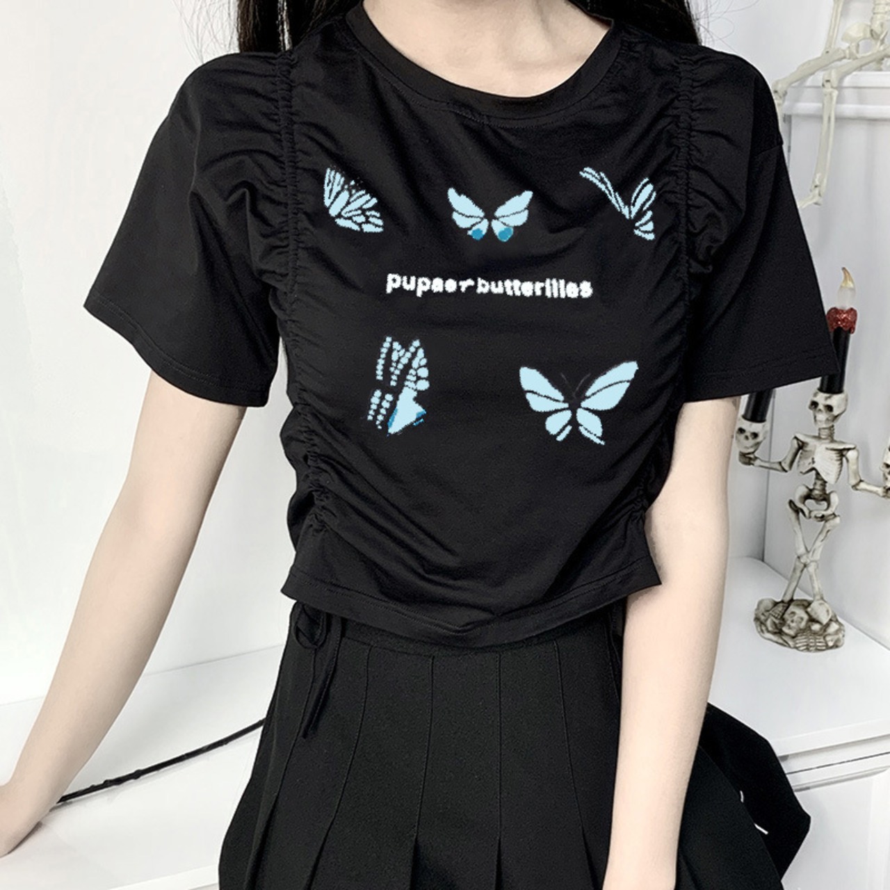 Butterflyデザイン プリント柄ギャザーTシャツブラック薄手ショート 半袖 ハーフスリーブ ストリート YU4633828