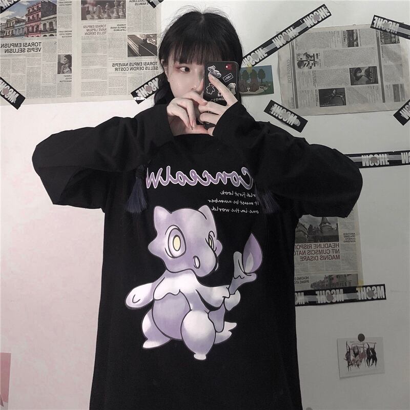 ホワイトTシャツシャツ レディーストレンドダークプリント柄ゆったりルーズラウンドネックトップス ロング Oネック 長袖 デーモン8926924