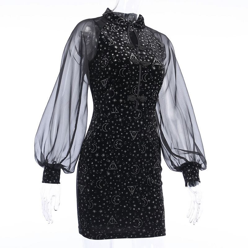 ダークブラック夏服スリーブプリント柄 ランタンスリーブ 夏物 スタイル ワンピース YU5241934