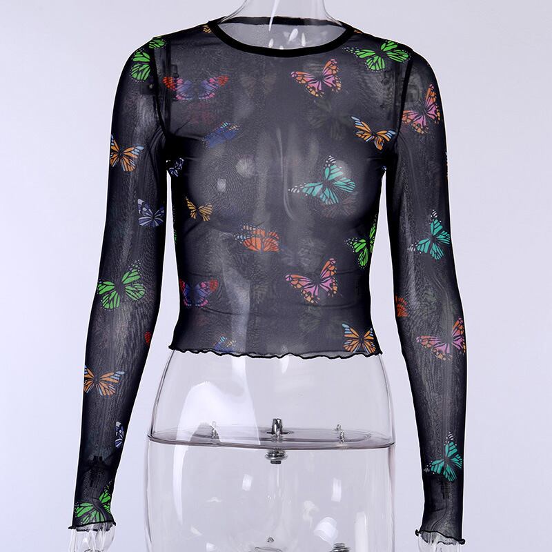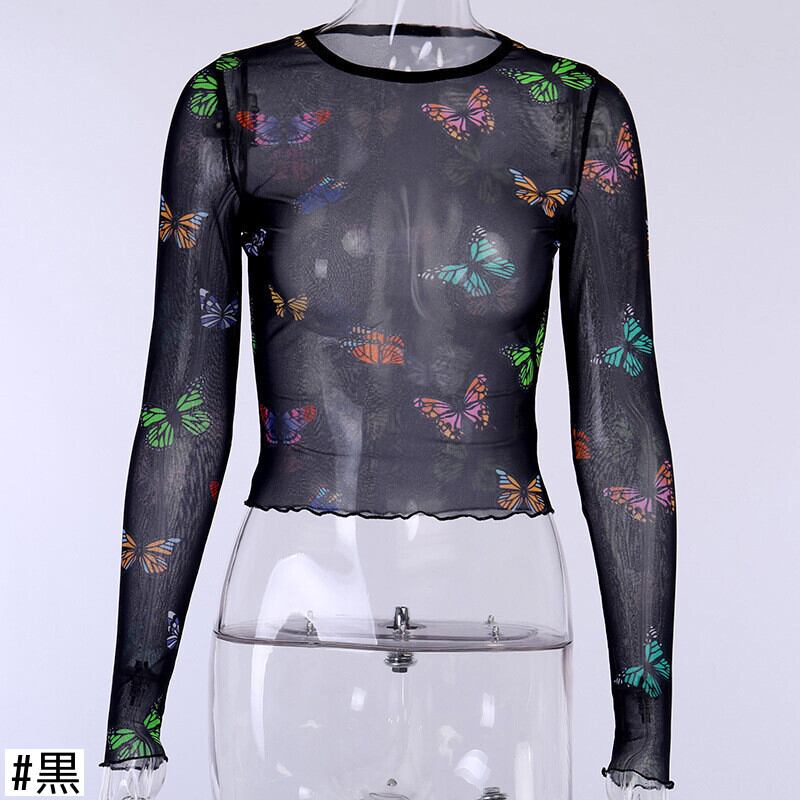 韓国ファッションButterflyデザイン プリント柄ゆったりメッシュストレッチ長袖スリーブTシャツ ロング エラスティック 伸縮 スタイル YU8961807