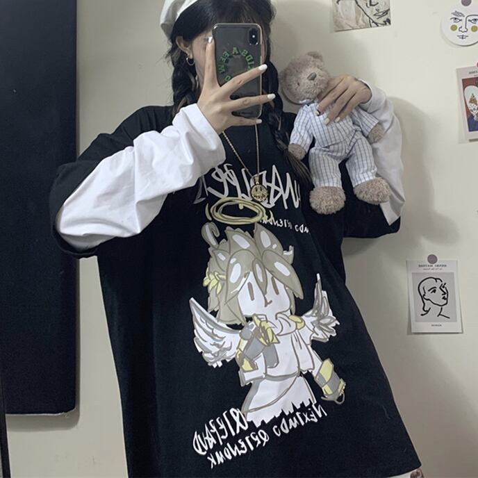 Tシャツシャツ レディースオータムトレンド韓国ファッションスタンダードプリント柄ブラックルーズ ロング レトロ 秋物 スタイル 長袖 デーモン4210704