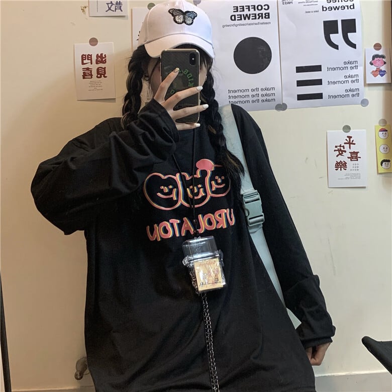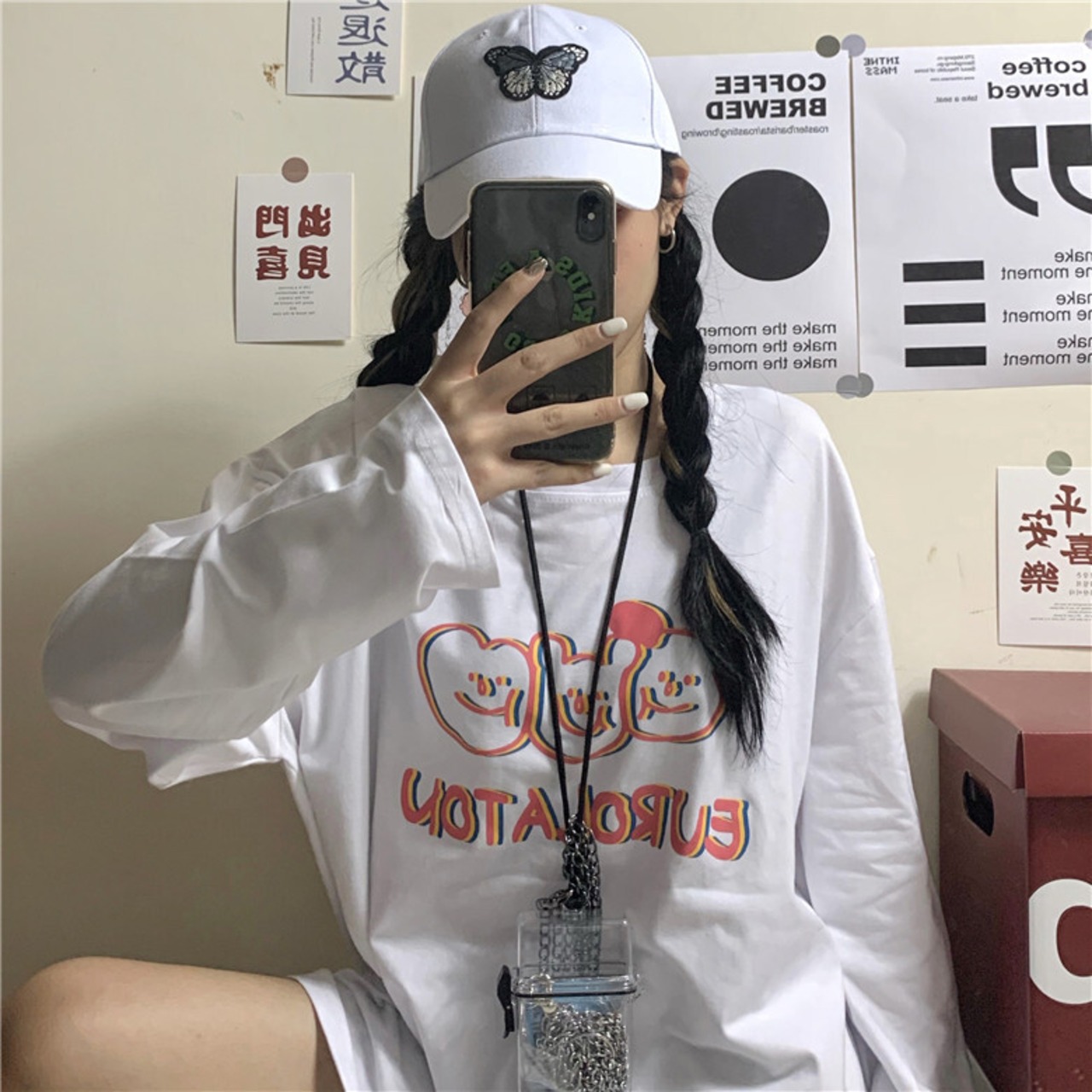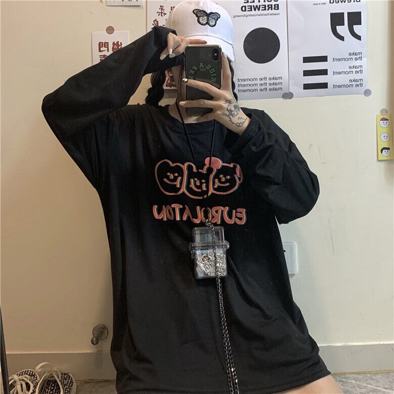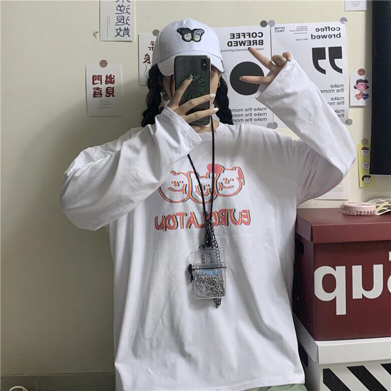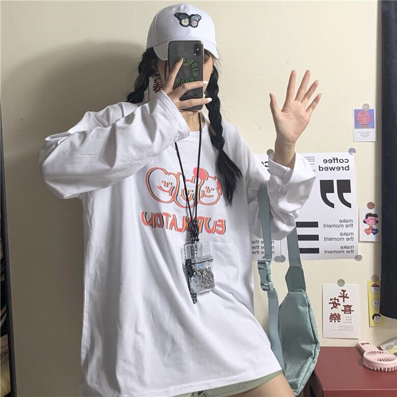 Tシャツシャツ 薄手オータムトレンド韓国ファッションスタンダードプリント柄ゆったりルーズトップス ロング レトロ 秋物 スタイル 長袖 デーモン2966840