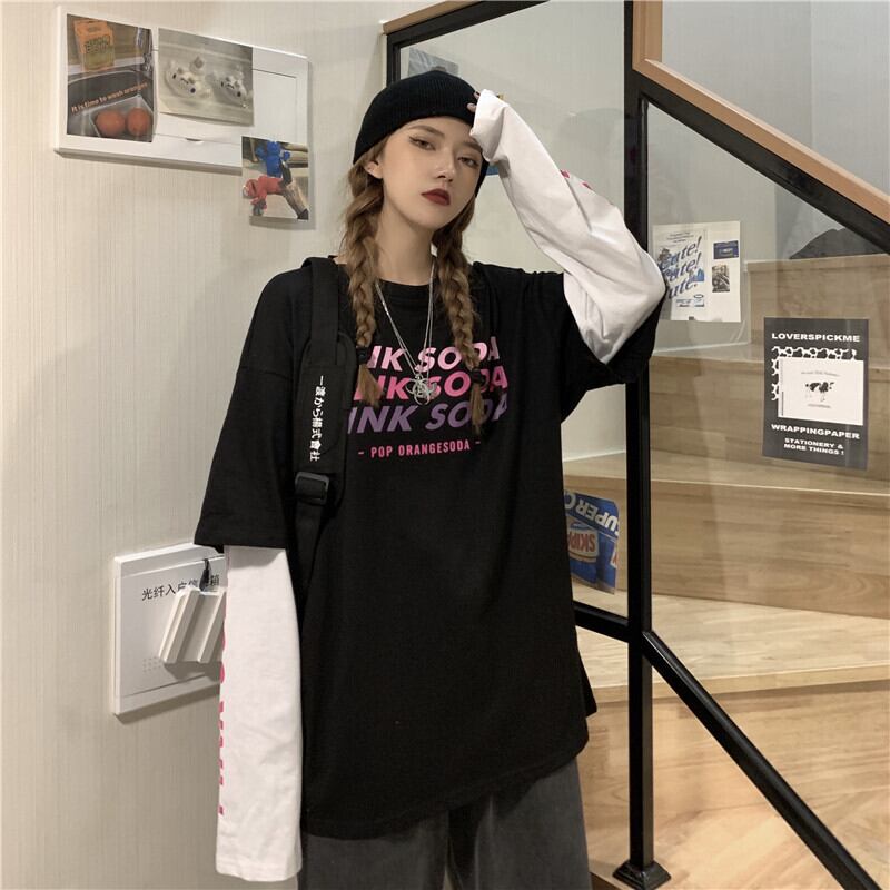 オータムトップス レディーストレンド韓国ファッションスタンダードプリントゆったりシャツ 薄手ルーズホワイトラウンドネック長袖スリーブTシャツ ロング レトロ 秋物 Oネック デーモン2593519