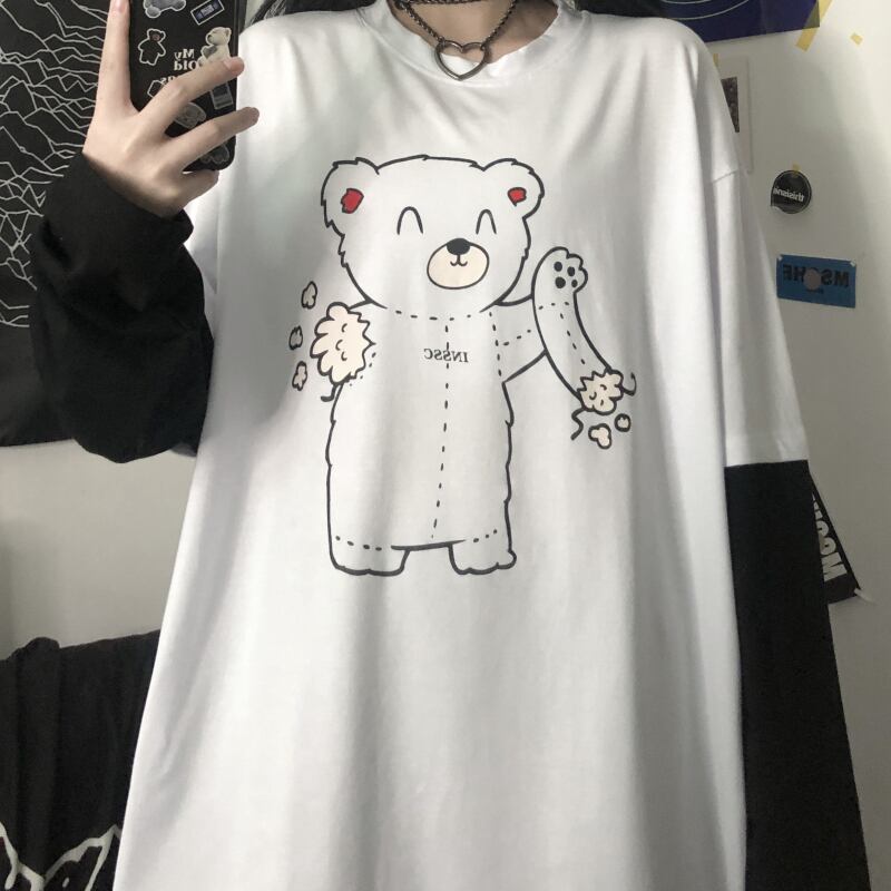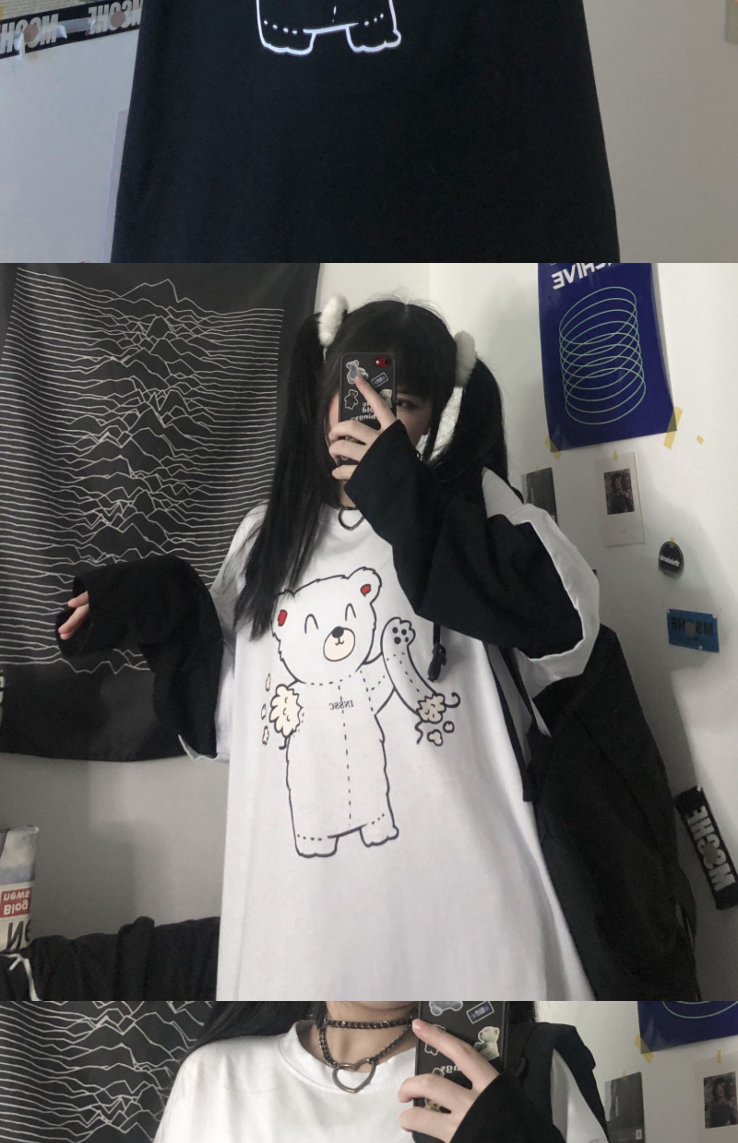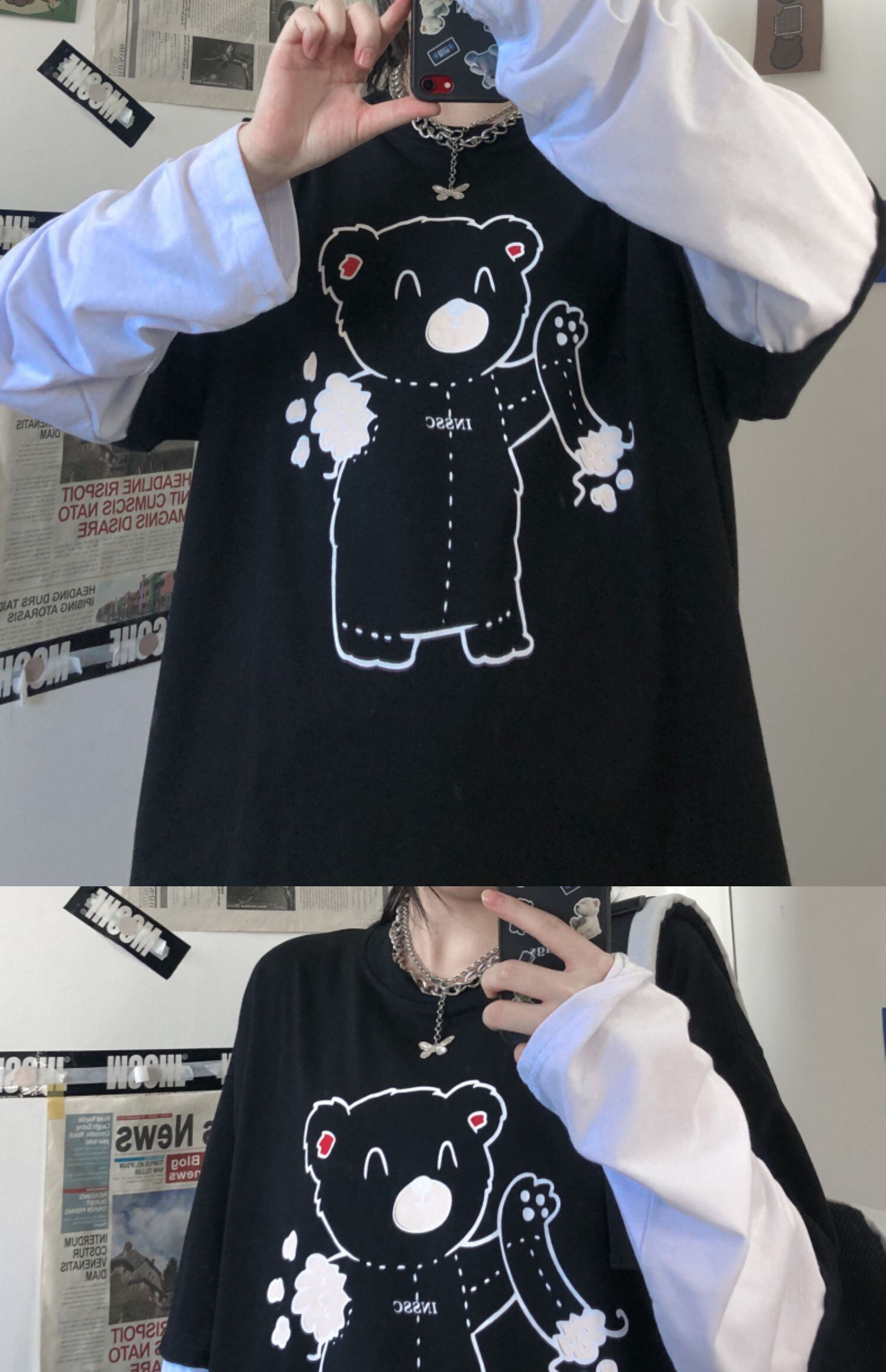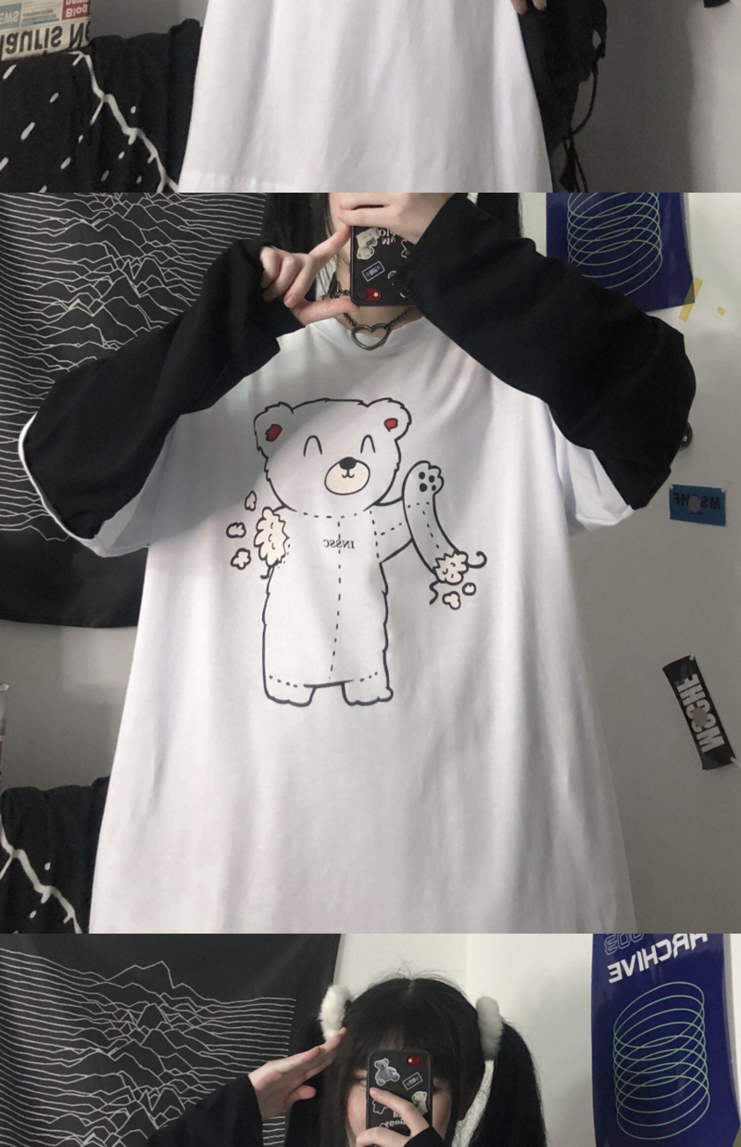 Tシャツレディースオータム韓国ファッショントレンドプリント柄ホワイトルーズトップス ロング 秋物 スタイル 長袖 デーモン0812883
