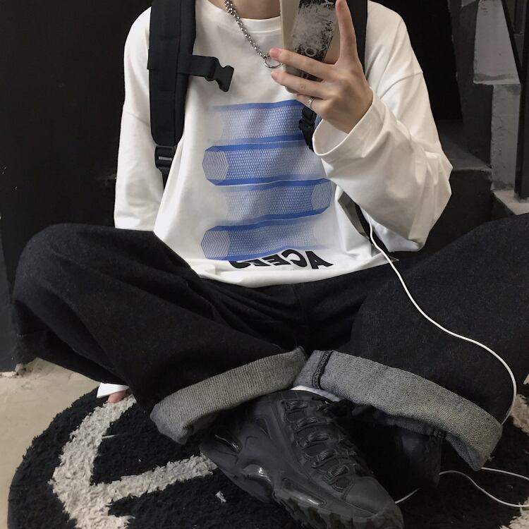 Tシャツシャツ レディース韓国ファッショントレンドスタンダードプリントゆったりルーズホワイトトップス ロング レトロ ボーイズ スタイル 長袖 デーモン1170971