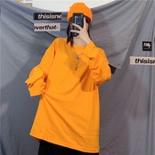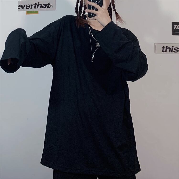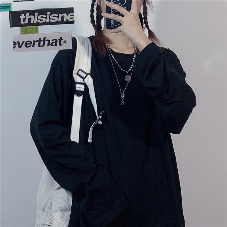 Tシャツレディースオータム韓国ファッショントレンドスタイルソリッド カラーラウンドネックルーズホワイトトップス ロング 原宿 秋物 Oネック ソリッドカラー ボーイズ 長袖 デーモン3902124