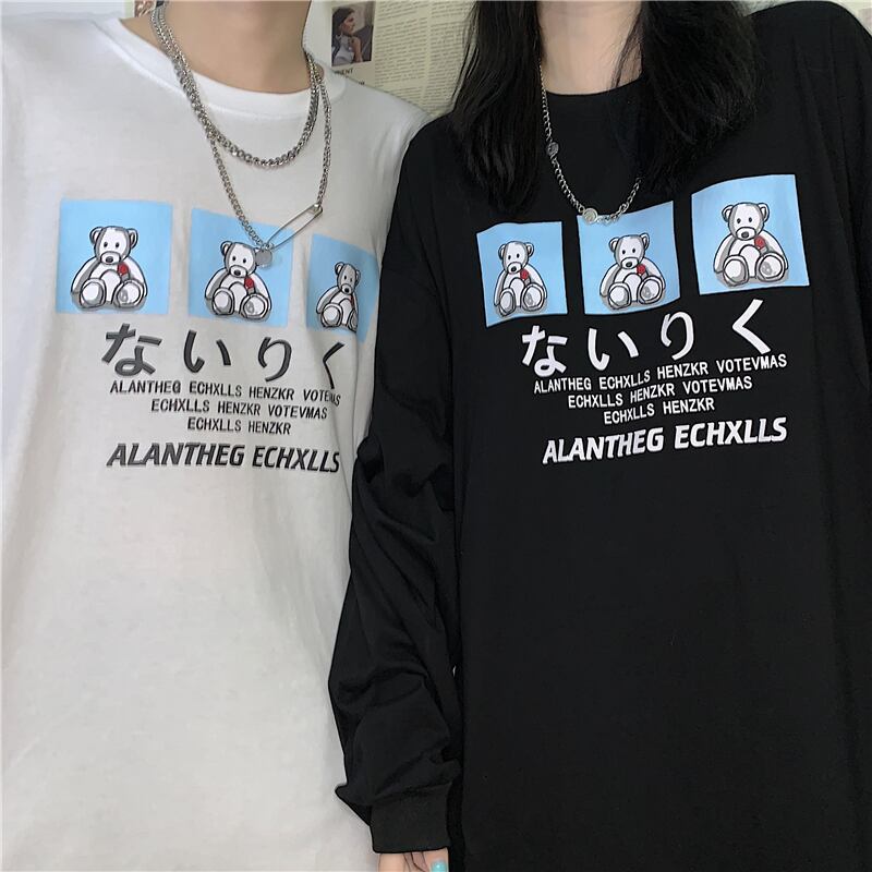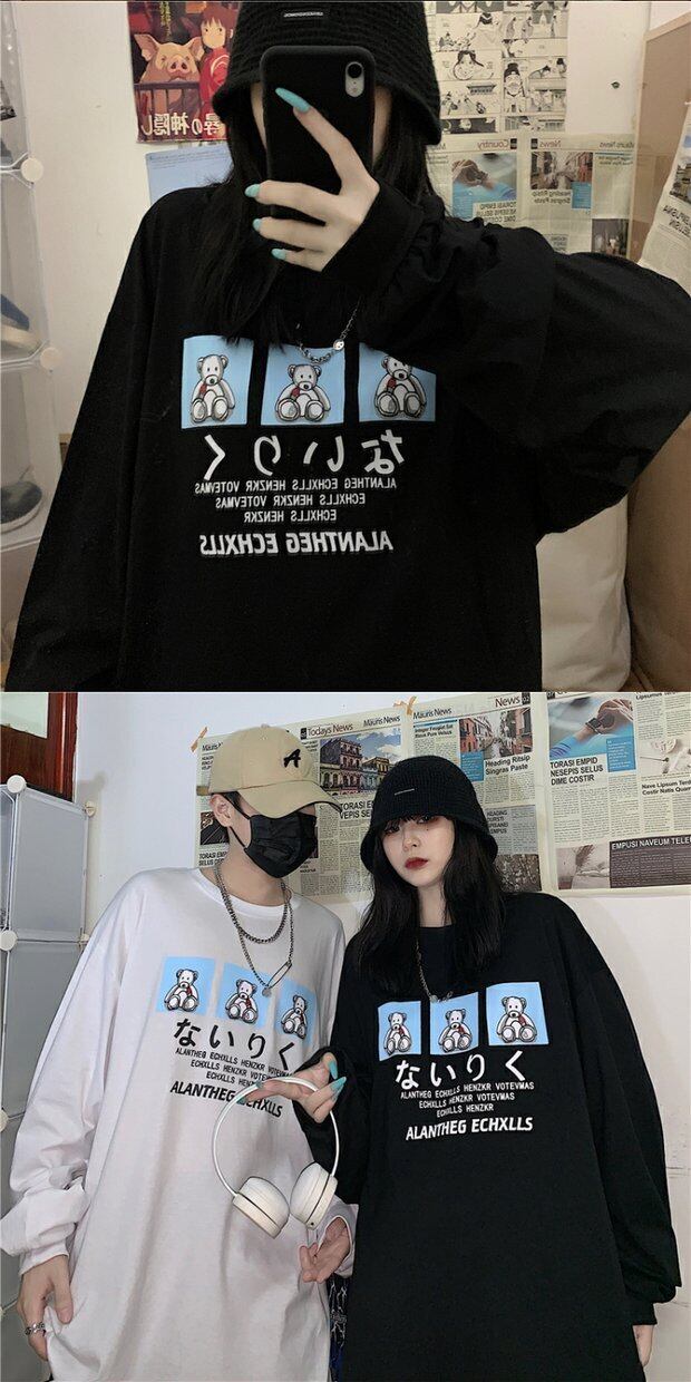 Tシャツシャツ トップス オータムトレンド韓国ファッションプリント柄ルーズブラックゆったり ロング 秋物 ボーイズ スタイル 長袖 デーモン3346347