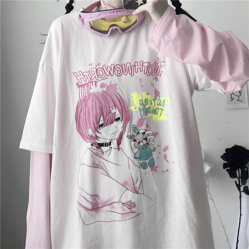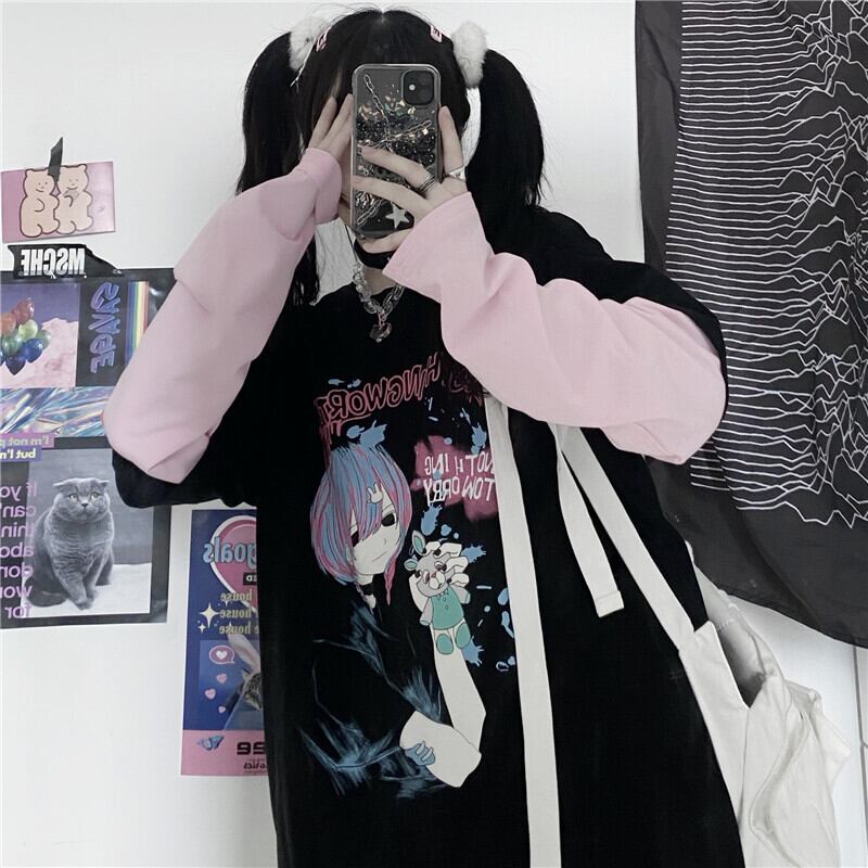 レディースオータム韓国ファッショントレンドプリントルーズTシャツ ロング 秋物 スタイル 長袖 デーモン3167506