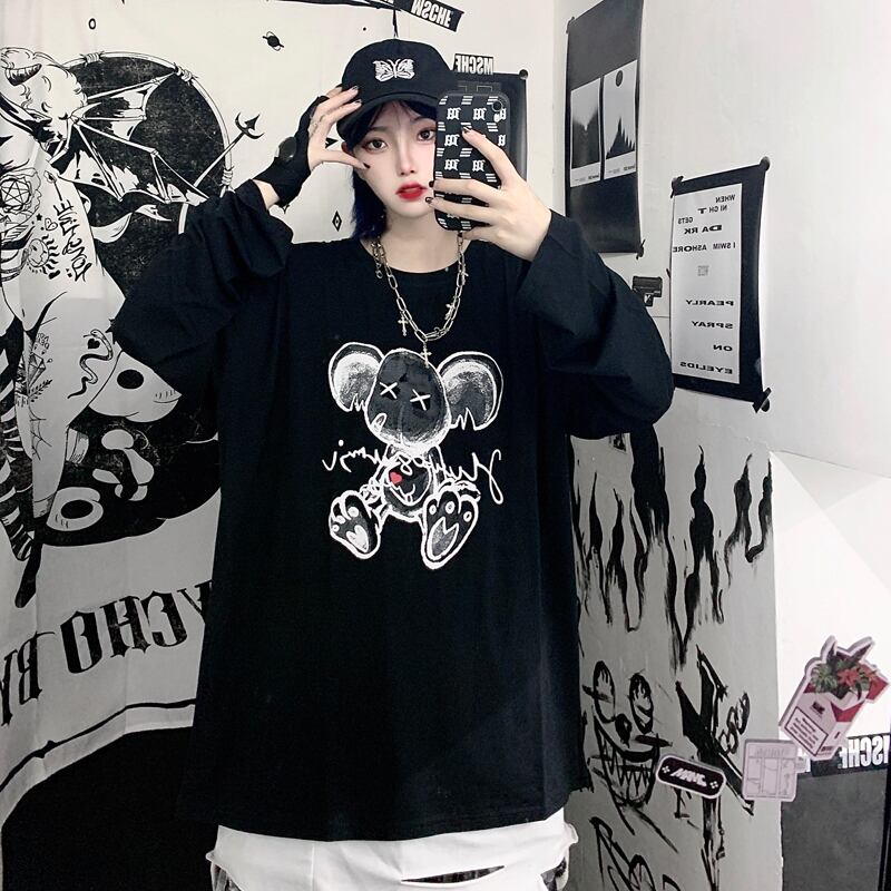 Tシャツレディースオータム韓国ファッショントレンドプリント柄ゆったりブラックルーズトップス ロング 原宿 秋物 ボーイズ スタイル 長袖 デーモン6881898