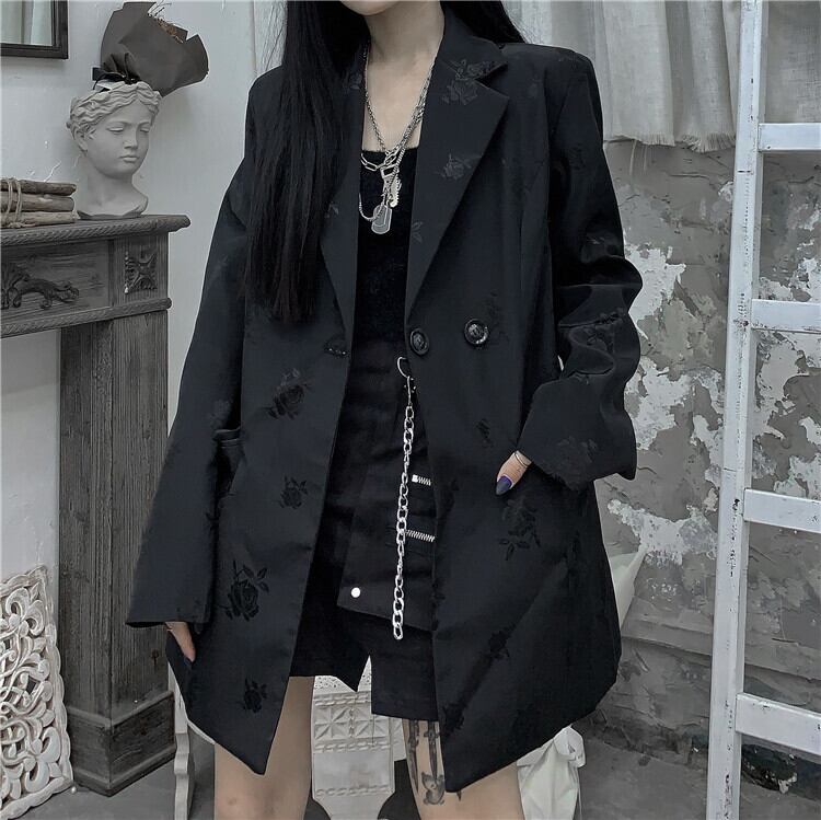 ブレザー オータムスタイル韓国ファッションスタンダードブラックルーズトップス レトロ ストリート 秋物 ミドル丈 デーモン6760563