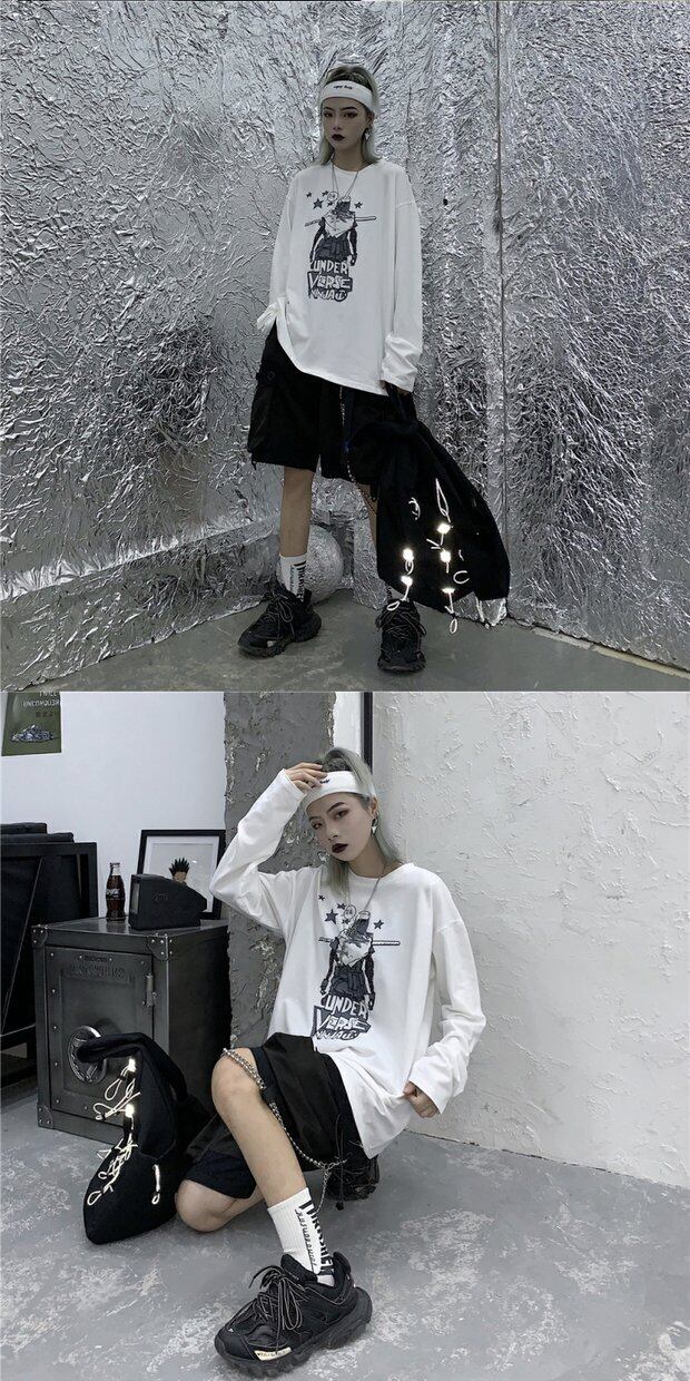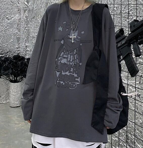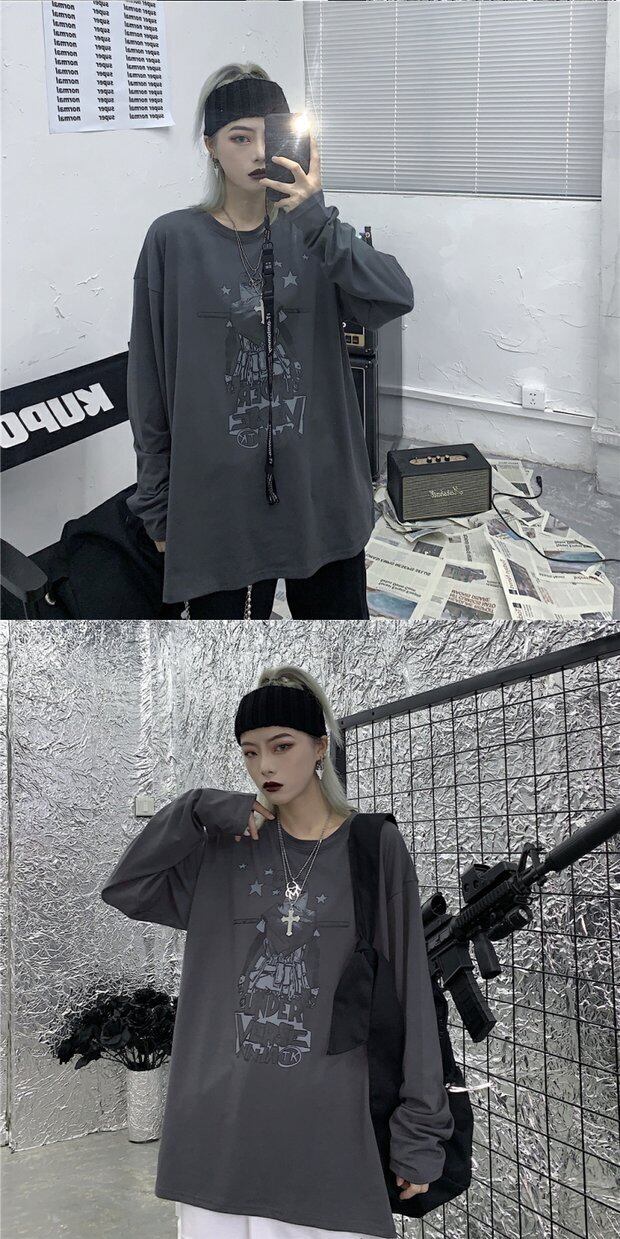 Tシャツシャツ レディースオータム韓国ファッショントレンドプリントゆったりホワイトルーズトップス ロング 秋物 スタイル 長袖 デーモン8937216