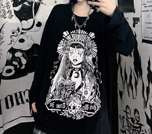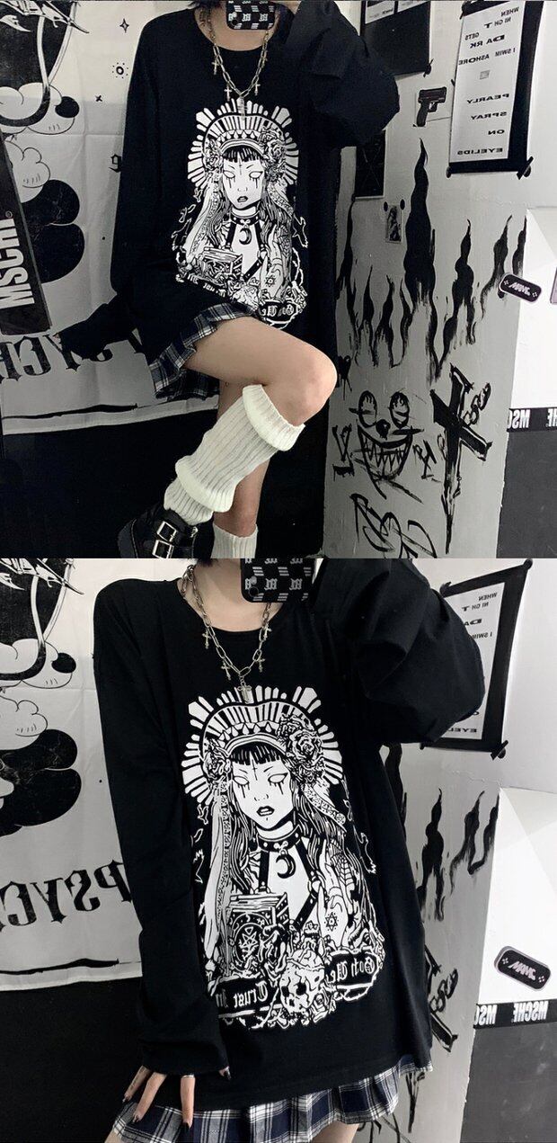 トップス レディースオータム韓国ファッショントレンドダークブラックプリントゆったりシャツ ルーズTシャツ ロング 原宿 秋物 ボーイズ スタイル 長袖 デーモン9643352