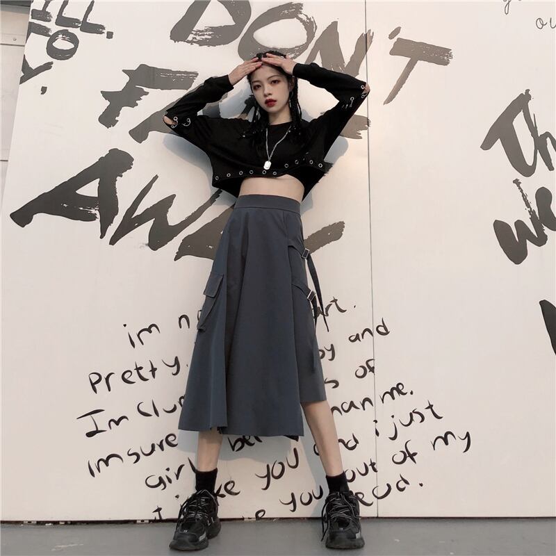 スカート スタンダードルーズAライン韓国ファッショントレンドスタイルポケットロングレディース レトロ 原宿 Museum7307911