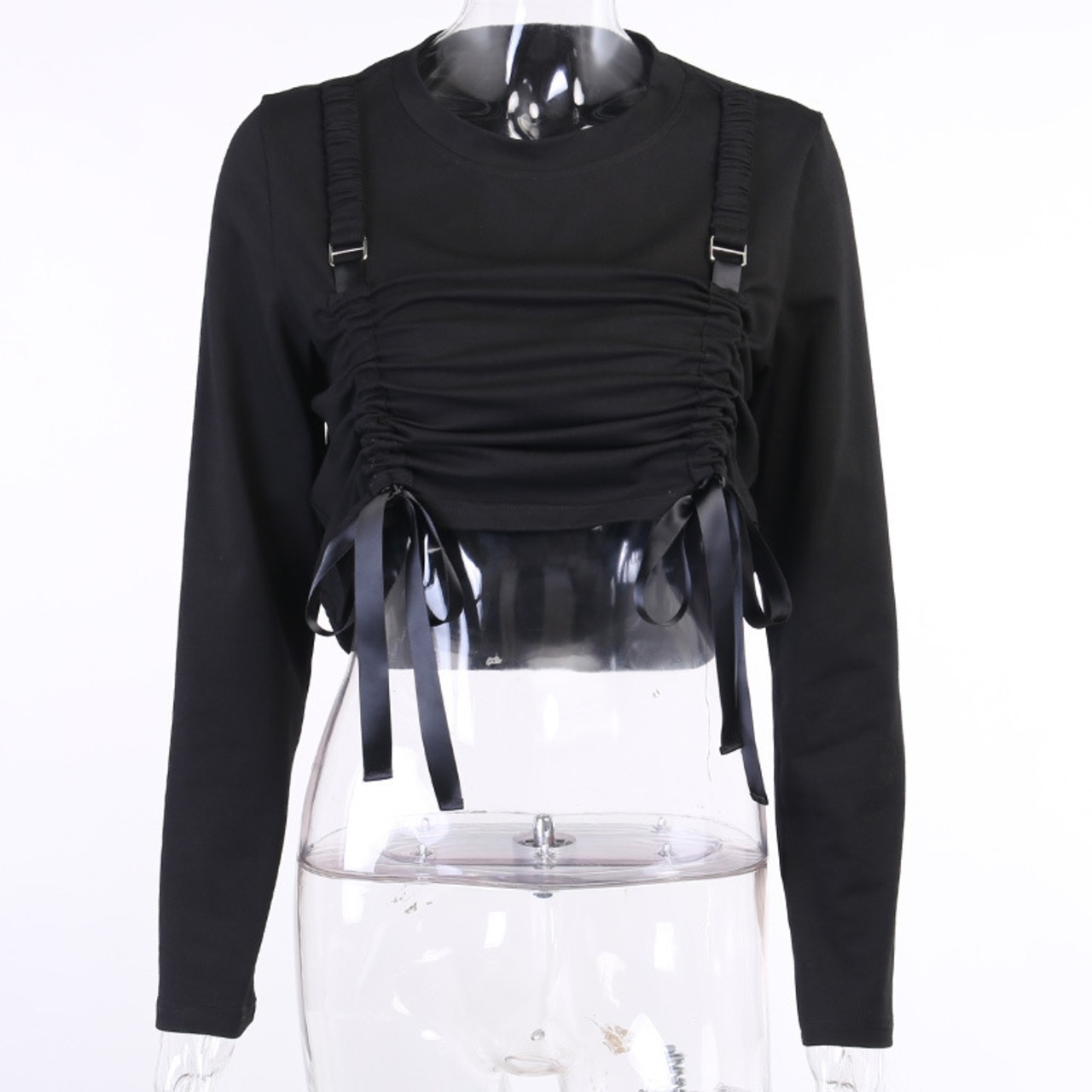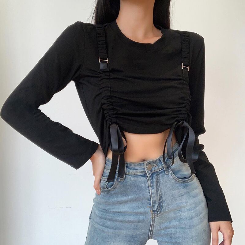 ダークプリーツギャザー長袖スリーブTシャツレディースクロップトップ トップス ロング ストリート ボーイズ YU11371588214