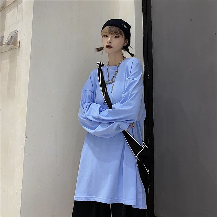 Tシャツシャツ レディーストレンド韓国ファッションルーズソリッド カラースプリング秋物トップス ゆったり ロング コットン 春物 オータム ソリッドカラー スタイル 長袖 Museum9644369