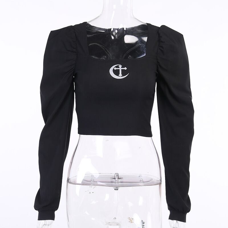 ダークブラック秋物ウィンタークロップドスリーブトップス レディーストレンドプリント長袖 ロング オータム 冬物 Tシャツ スクウェア YU10089813559