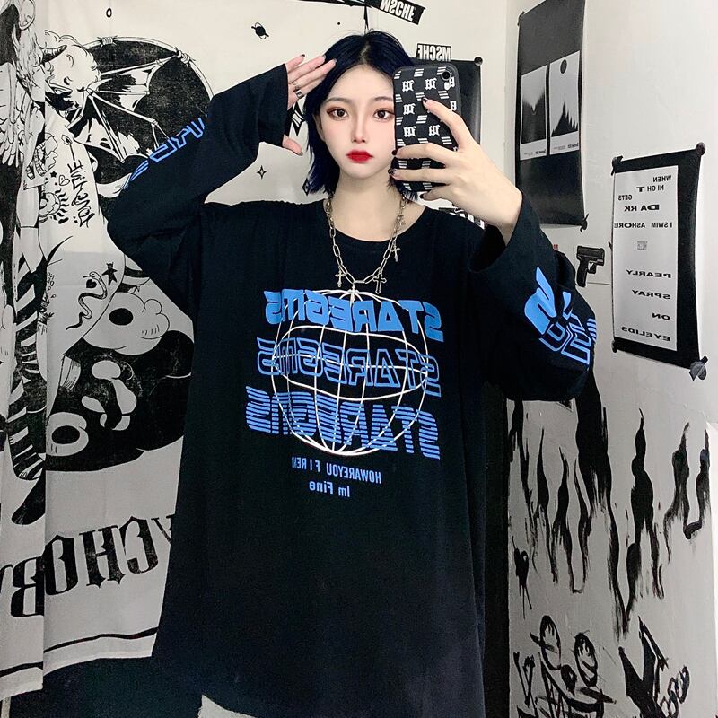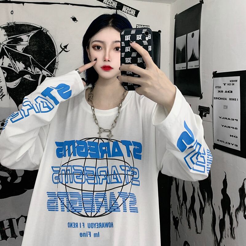 Tシャツレディース秋物韓国ファッショントレンドプリントルーズラウンドネックトップス ロング 原宿 オータム Oネック ボーイズ スタイル 長袖 デーモン60824344484