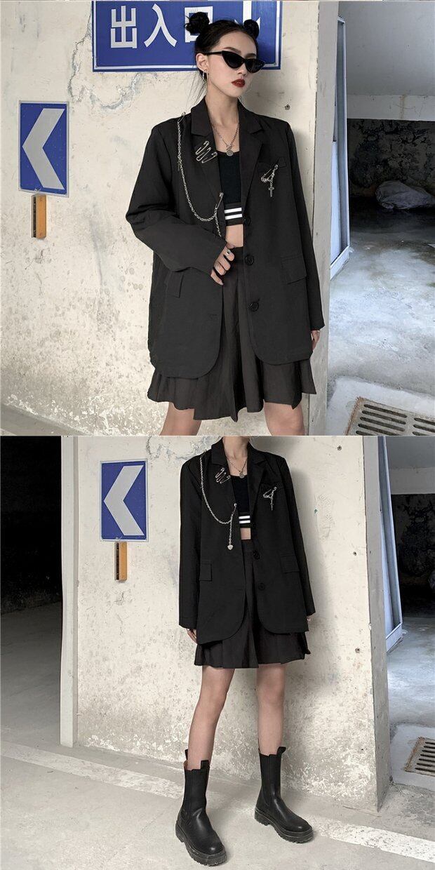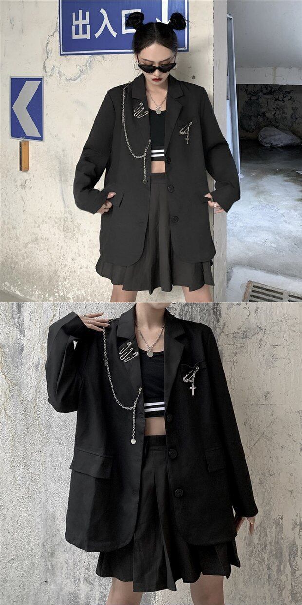 ブラックジャケット レディース秋物トレンド韓国ファッションチェーン ルーズカジュアルトップス ロング オータム ボーイズ スタイル 長袖 デーモン83841466676