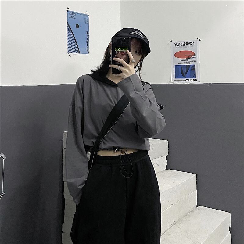 Tシャツレディース秋物韓国ファッショントレンドスタンダードギャザーショートルーズブラックフードトップス ロング レトロ オータム スタイル 長袖 デーモン38017426518