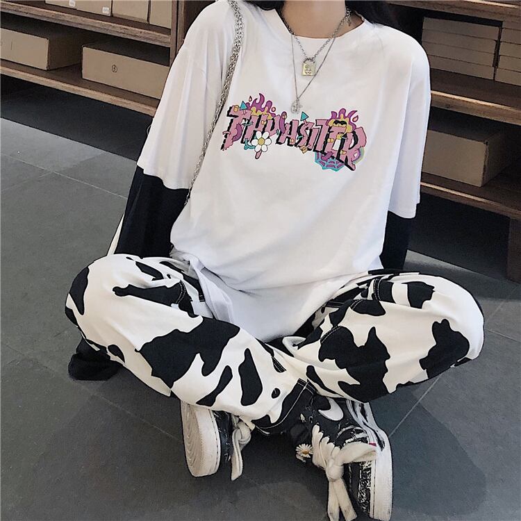 レディーストップス 秋物韓国ファッショントレンドプリントブラックルーズTシャツ ロング オータム スタイル 長袖 デーモン96411051923