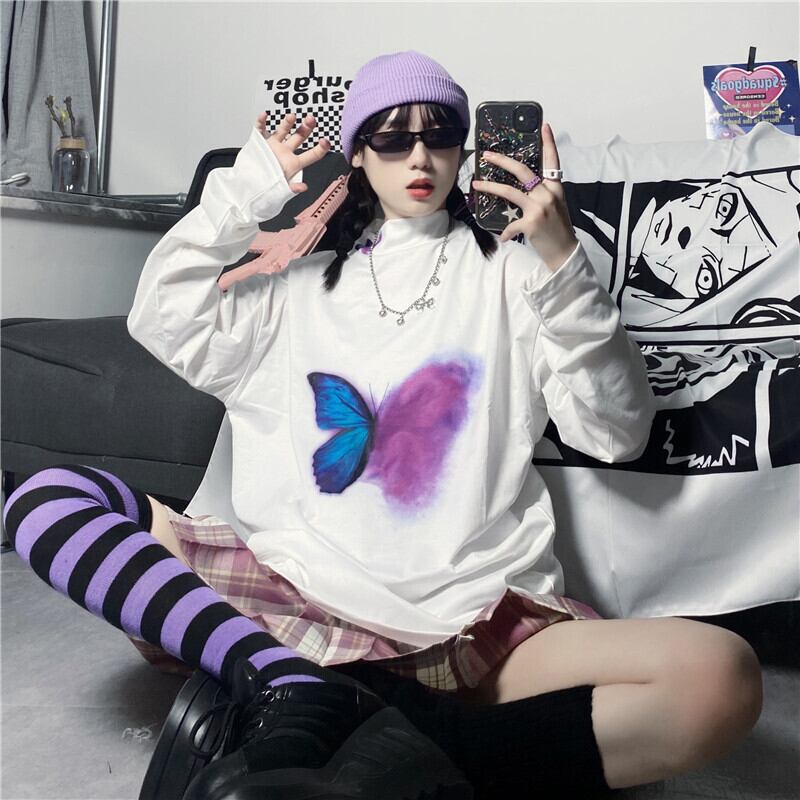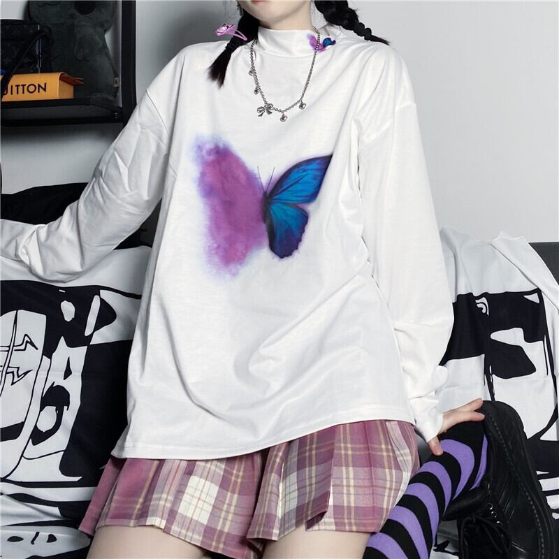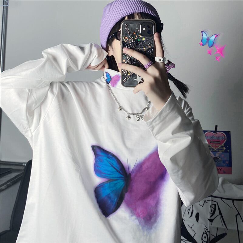 Tシャツシャツ 秋物韓国ファッショントレンドButterflyデザイン プリント柄ホワイトルーズ ロング 原宿 オータム スタイル 長袖 デーモン17364537069