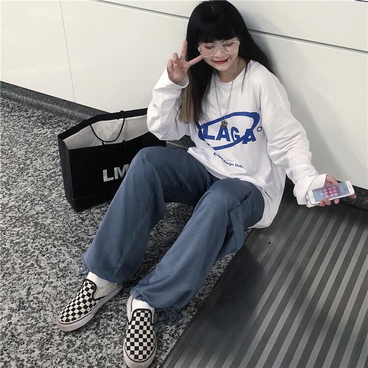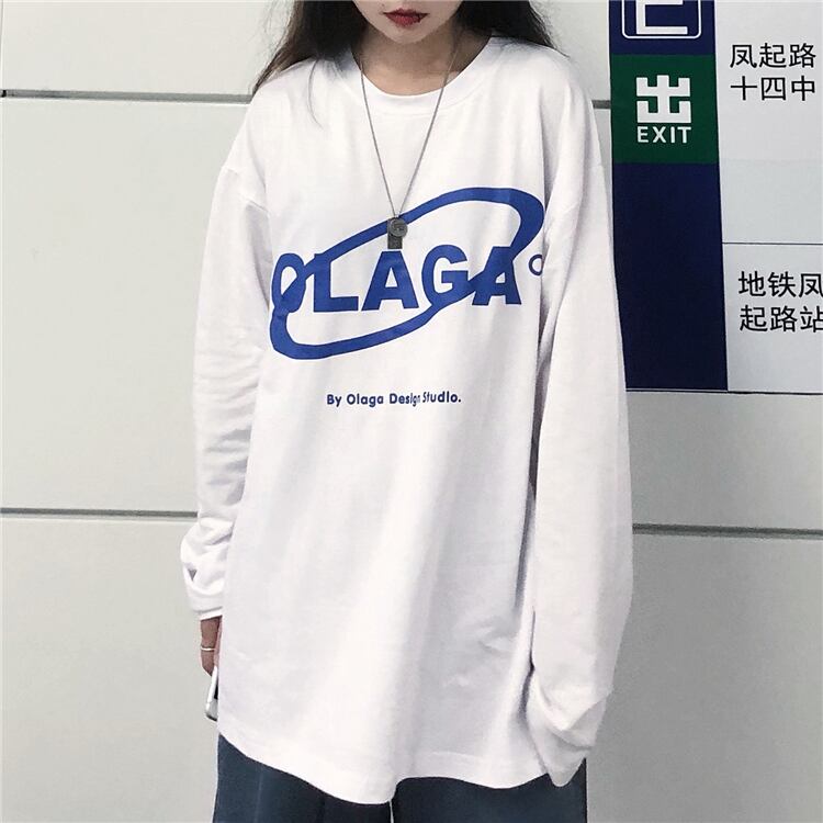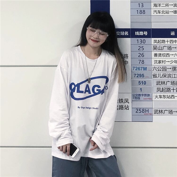 Tシャツレディース秋物韓国ファッショントレンドプリントホワイトルーズゆったりトップス ロング オータム スタイル 長袖 デーモン41929383399