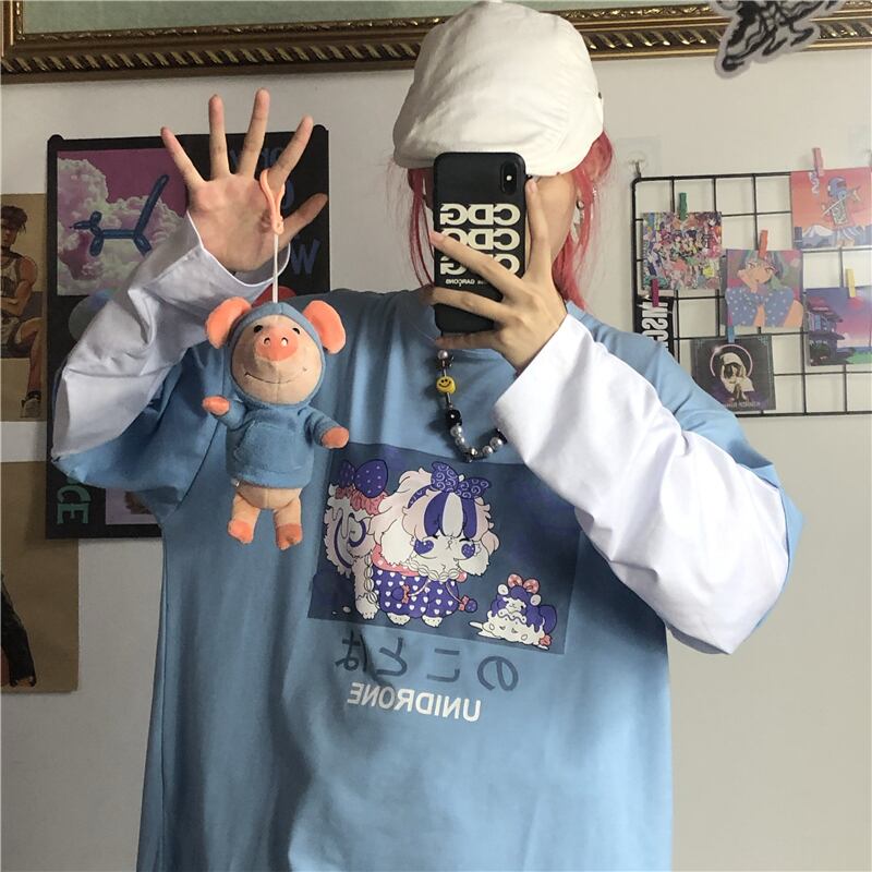 レディーストップス 秋物韓国ファッショントレンドプリント柄ルーズTシャツ ロング ピンク オータム スタイル 長袖 デーモン73231964576