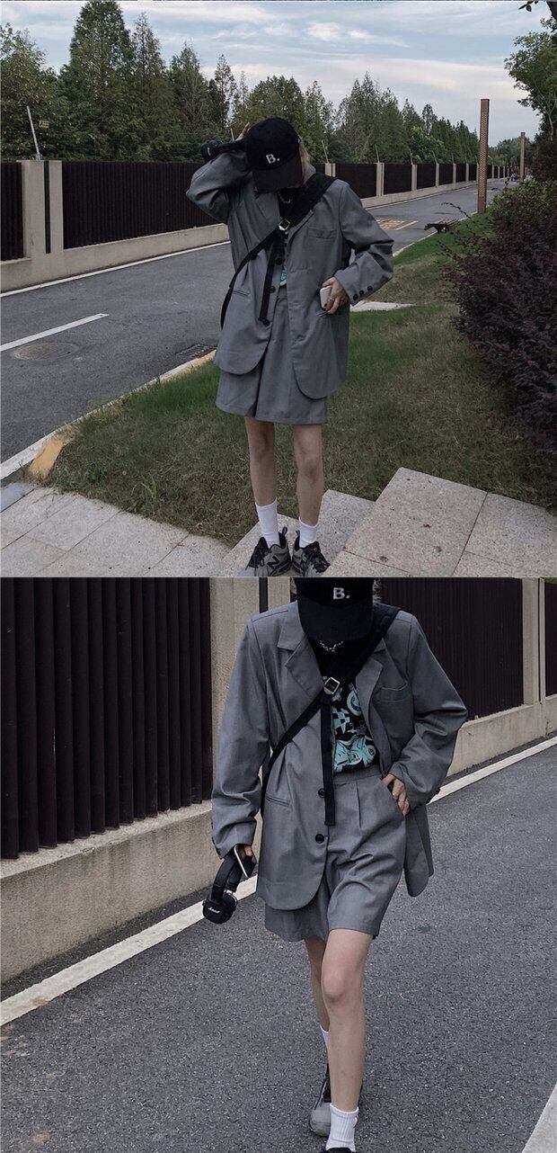 色:黒のスーツジャケットM,黒のスーツジャケットL,グレーブレザーM,グレースーツジャケットL,黒のショートパンツ,グレーパンツ