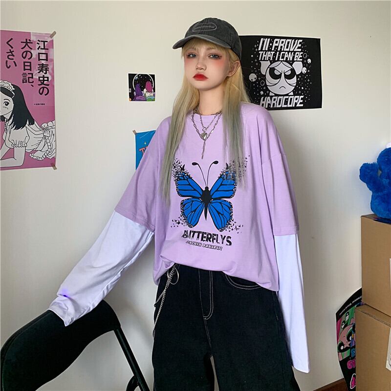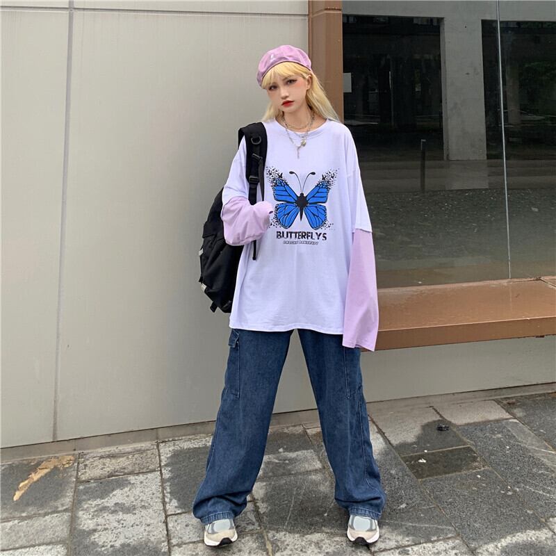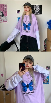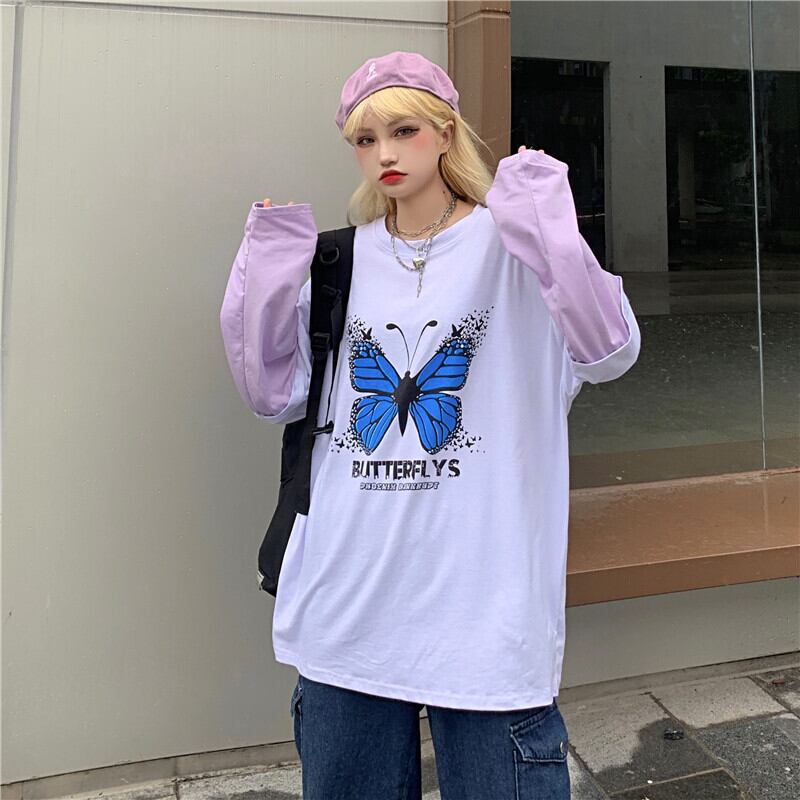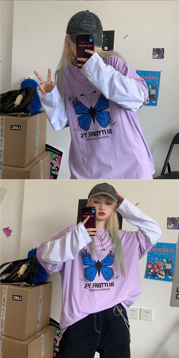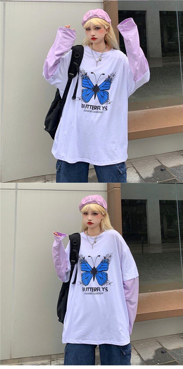 Tシャツレディース秋物韓国ファッショントレンドスタイルButterflyデザイン プリント柄ルーズトップス ロング 原宿 オータム 長袖 デーモン28910758108