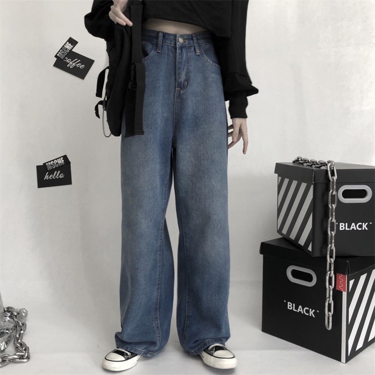 ジーンズ レディース韓国ファッショントレンドスタンダードワイドレッグパンツ ルーズハイウェストウェスト薄手 レトロ ワイドパンツ スタイル ウエスト デーモン74192371378