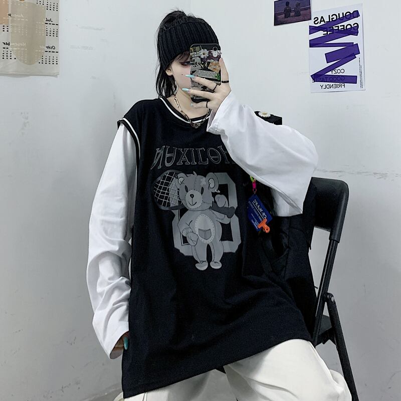 トップス レディース秋物韓国ファッショントレンドプリント柄ルーズTシャツ ロング オータム ボーイズ スタイル 長袖 デーモン87764116395