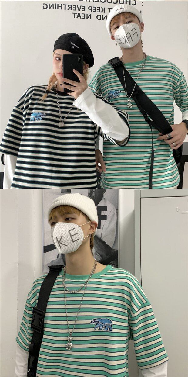 レディーストップス 秋物韓国ファッショントレンドスタンダードストライプルーズTシャツ ロング レトロ オータム ステッチ スタイル 長袖 デーモン17446107395
