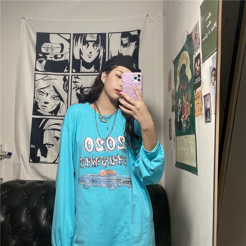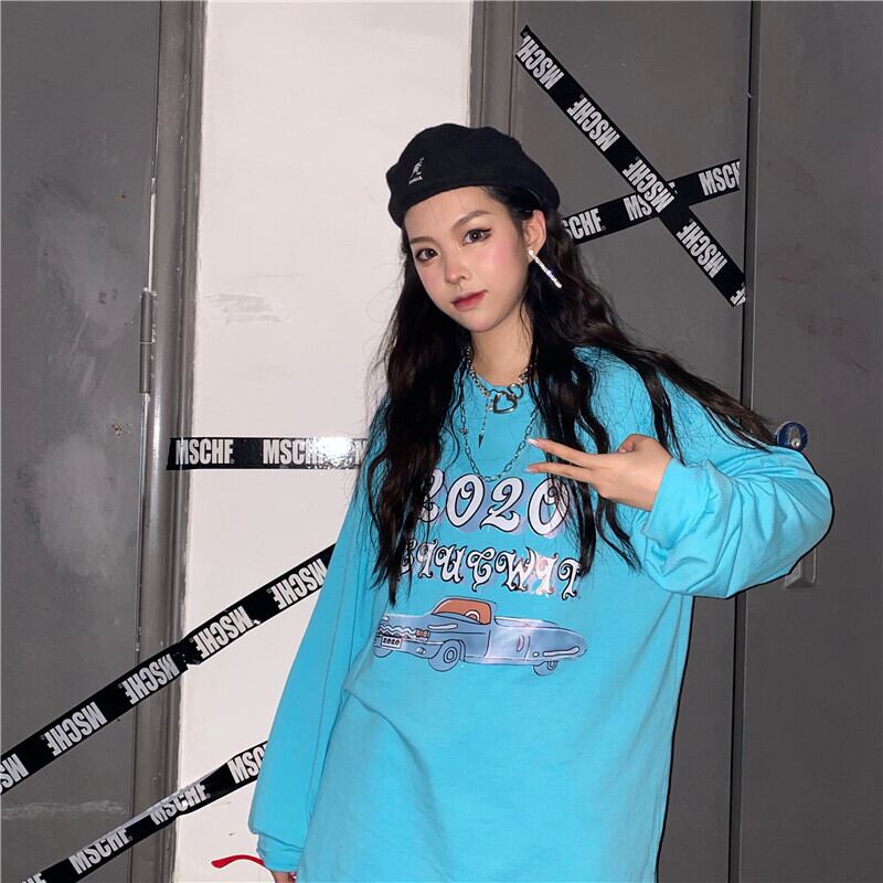 Tシャツシャツ レディース秋物韓国ファッショントレンドスタイルプリントルーズラウンドネック ロング オータム Oネック 長袖 デーモン68445327923