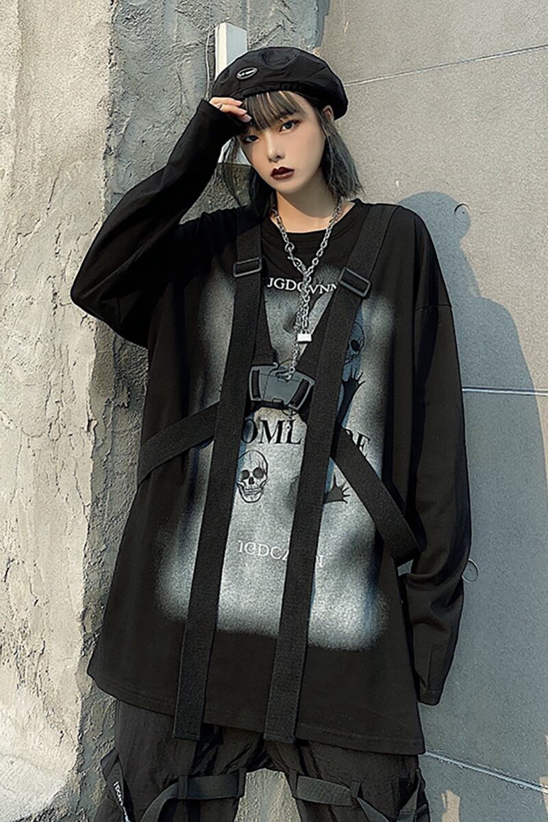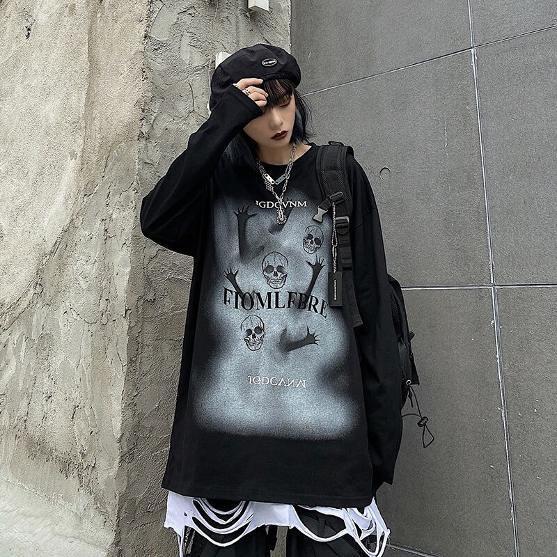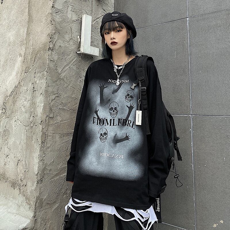 Tシャツレディース秋物韓国ファッショントレンドスタイルブラックルーズラウンドネックトップス ロング 原宿 オータム Oネック 長袖 デーモン16261682006