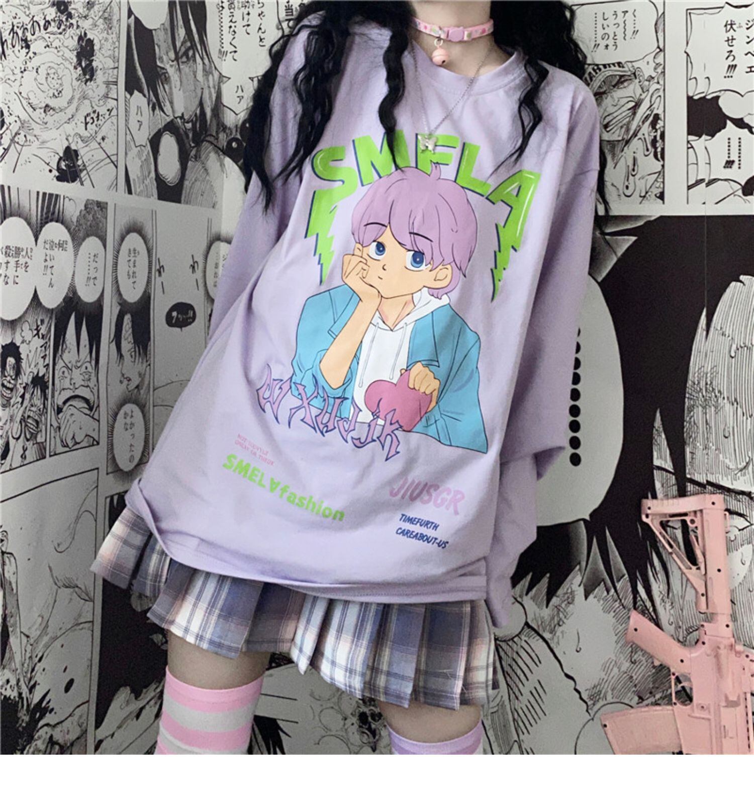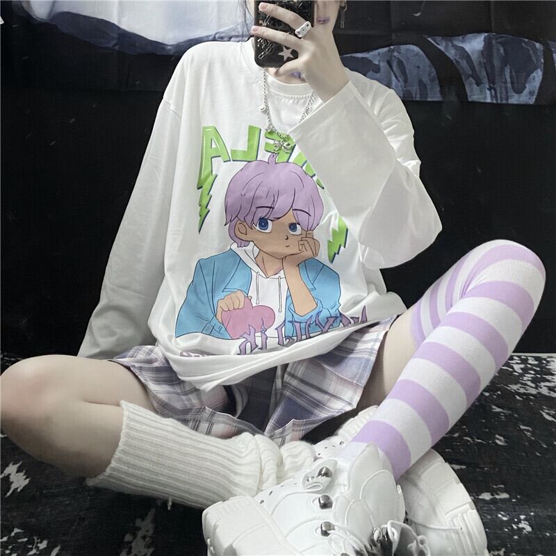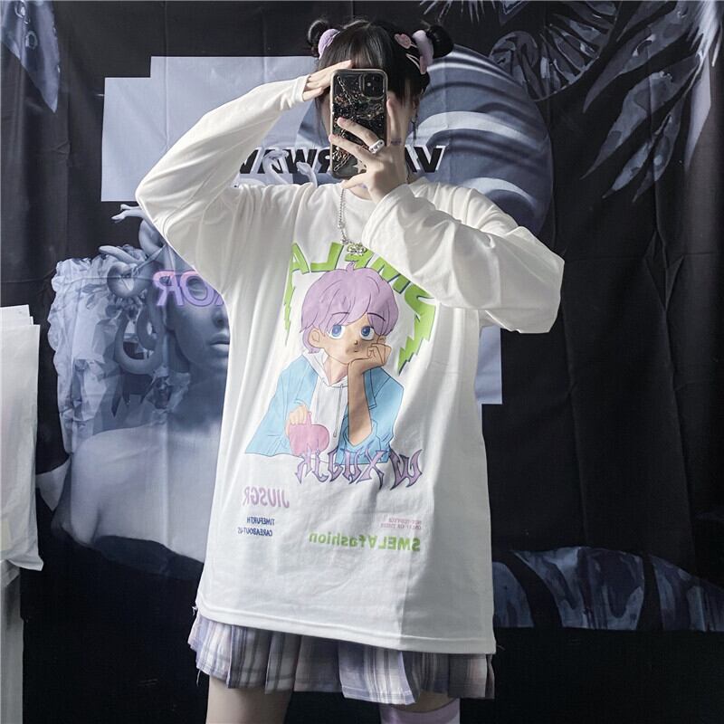 トップス 秋物韓国ファッショントレンドスタイルプリントTシャツシャツ ルーズゆったり ロング 原宿 オータム 長袖 デーモン23727340285