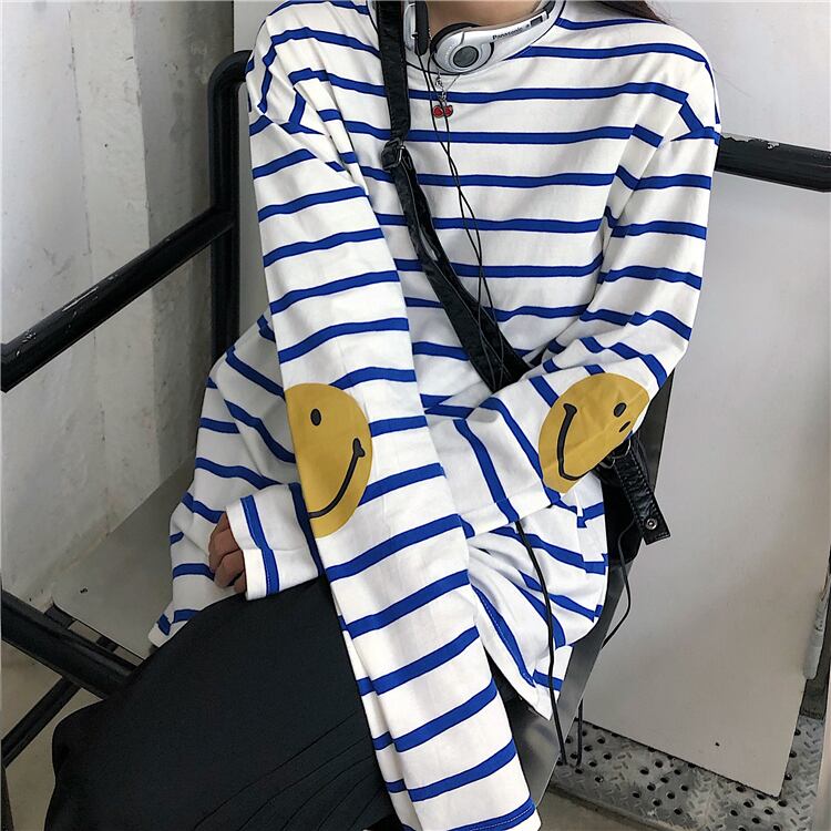シャツ トップス レディース秋物韓国ファッショントレンドスタンダードストライププリント柄ルーズTシャツ ロング レトロ オータム ボーイズ スタイル 長袖 デーモン91613659863