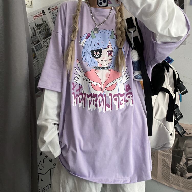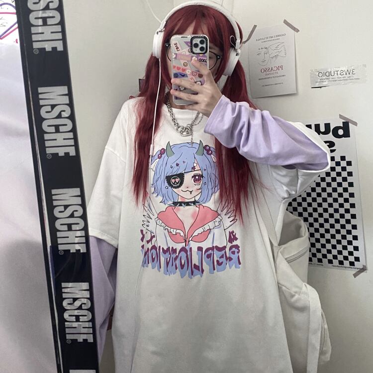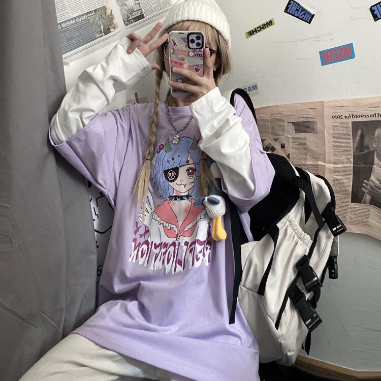 Tシャツレディース秋物韓国ファッショントレンドスタイルプリントルーズトップス ロング 原宿 オータム ボーイズ 長袖 デーモン52622895118