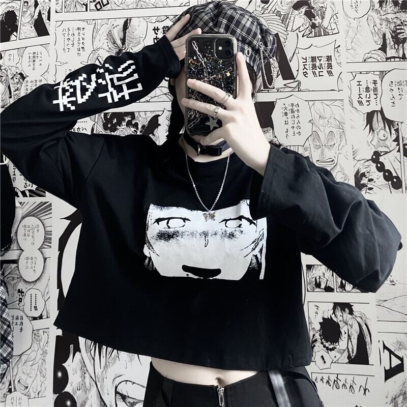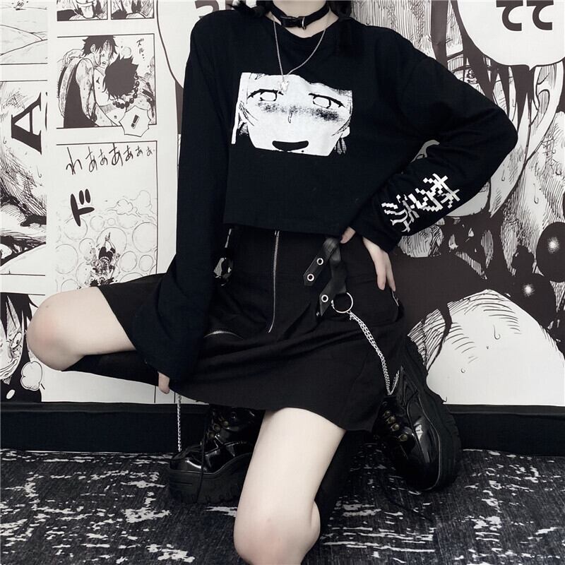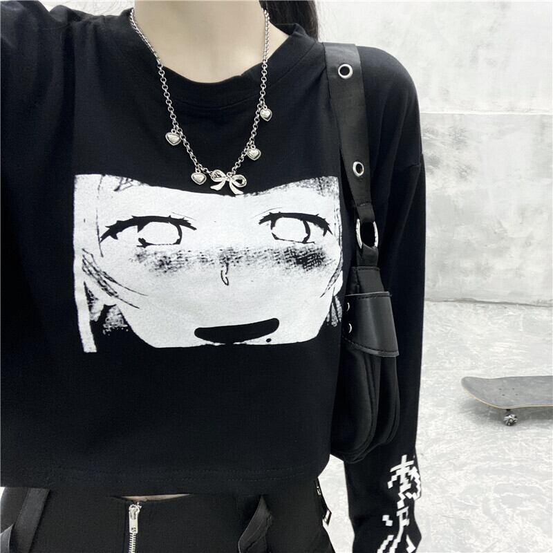 ショートトップス 秋物韓国ファッショントレンドダークプリント柄ブラックルーズTシャツ ロング オータム スタイル 長袖 デーモン38800462147