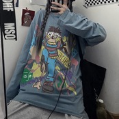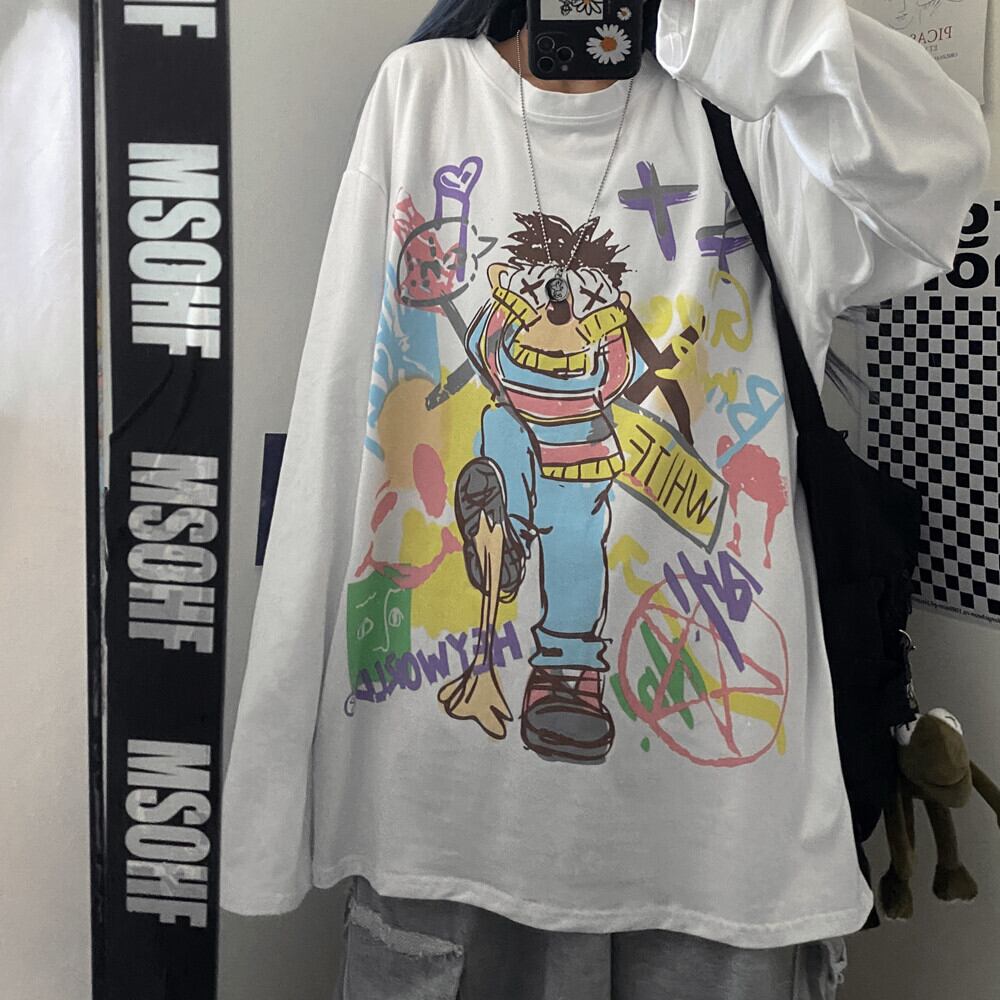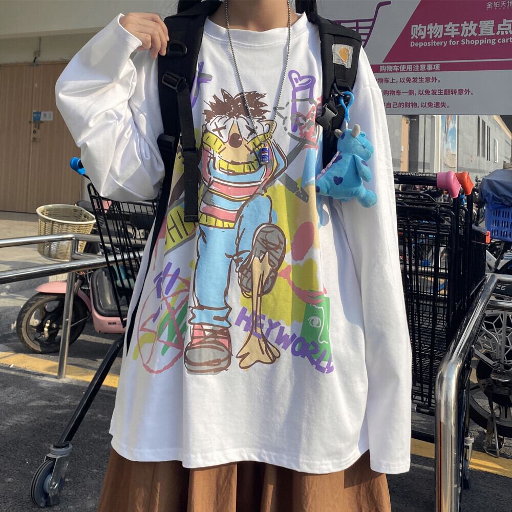 ブラウス 秋物韓国ファッショントレンドスタイルプリントルーズゆったりシャツ Tシャツ ロング 原宿 オータム ボーイズ 長袖 デーモン30075845114