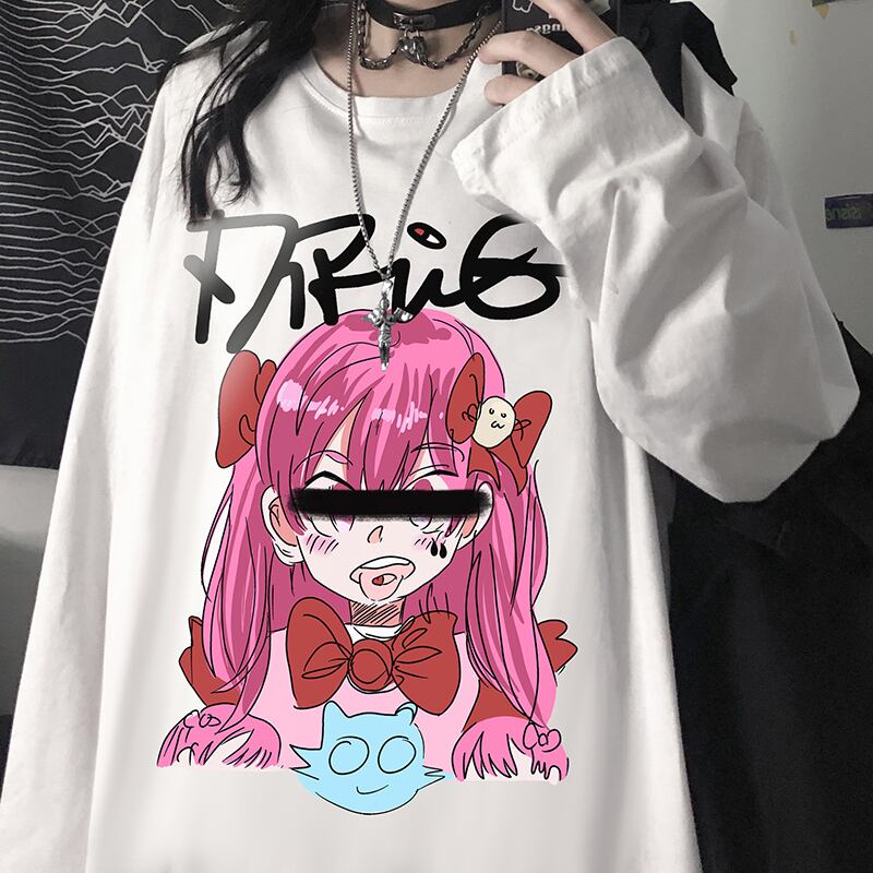 トップス 秋物韓国ファッショントレンドプリントブラックルーズ長袖スリーブTシャツ ロング オータム ボーイズ スタイル デーモン13350610576