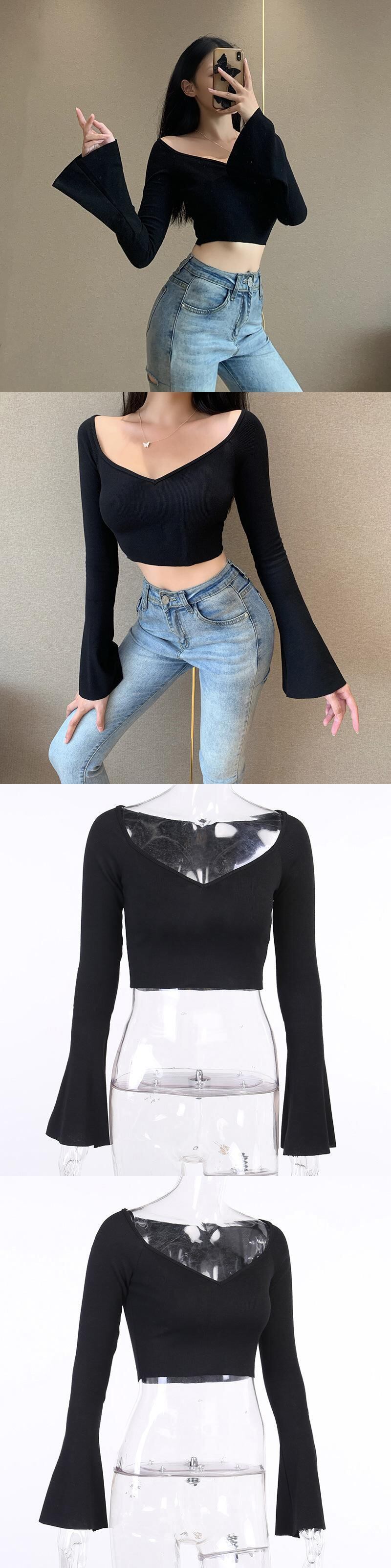 秋物トレンドスリーブトップス VネックTシャツ ロング オータム ヨーロピアン 長袖 YU82183558877